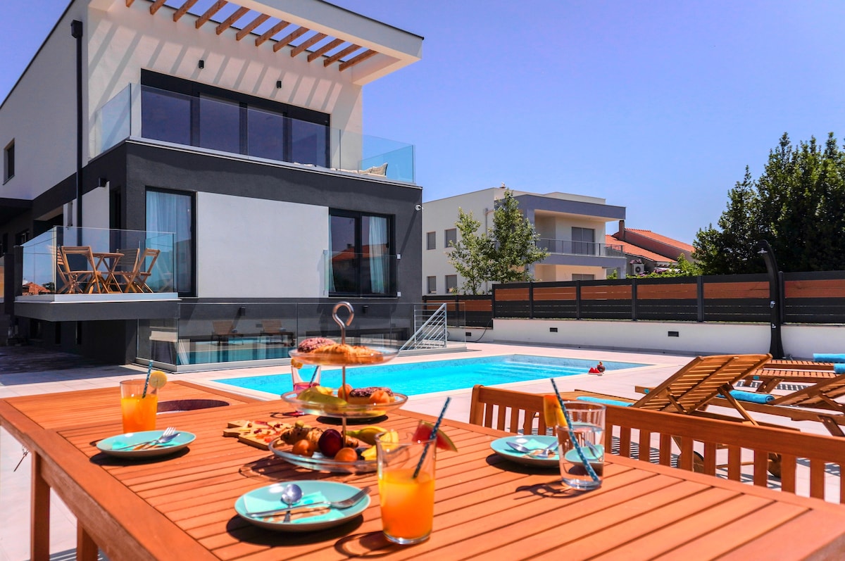 FŰTÖTT MEDENCE. Repülőgép célállomás. Kiváló elhelyezkedés a városközpontban. Ez az ingatlan 3 légkondicionált szobát tartalmaz nagy tévével, konyhával és nappalival, 2 fürdőszobával, terasszal, úszómedencével, szabadtéri jakuzzival, szaunával, grillezővel, szabadtéri zuhanyzókkal és napozóágyakkal, parkolással az udvaron. Zadar központjának csendes részén található, 900 méterre az óvárostól. A város látnivalói és éttermei 15 perces sétatávolságra vannak a lakástól. A repülőtér 10 kilométerre található. Tökéletes egy csendes és kellemes nyaraláshoz. Optikai internet. Üdvözlünk