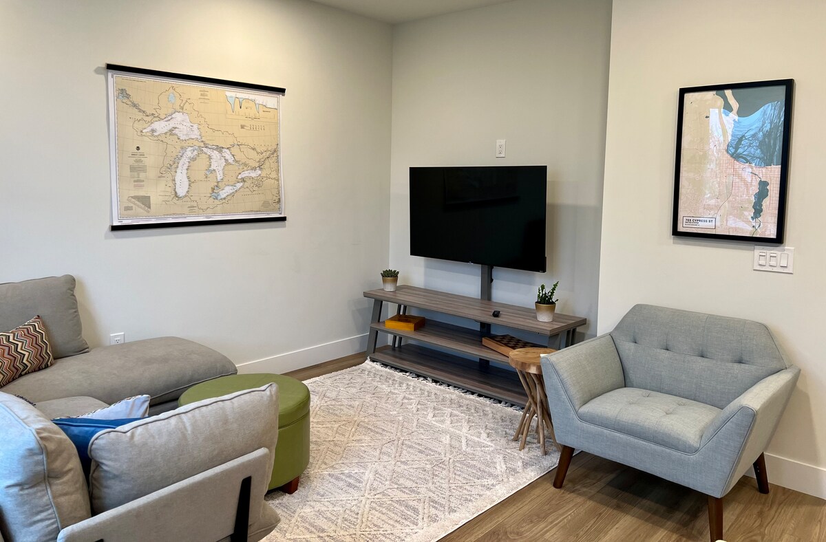 Üdvözlünk az otthonodban, távol az otthonodtól, miközben felfedezed Traverse Cityt. Ezt a belvárosi, egy hálószobás társasházi lakást átgondoltan, a kényelmet és a stílust szem előtt tartva alakították ki. Hangout a családi szobában bőséges ülőhellyel, valamint kábel- és streaming alkalmazásokkal ellátott intelligens TV-vel. Pihenj a hálószobában egy vadonatúj memóriahabos matraccal. Készíts bármilyen ételt egy teljesen felszerelt konyhában. A lakás Traverse belvárosában található, közvetlenül a tort Trailen, így könnyen elérhető minden, amit a környék kínál! Két új kerékpárral érkezik!