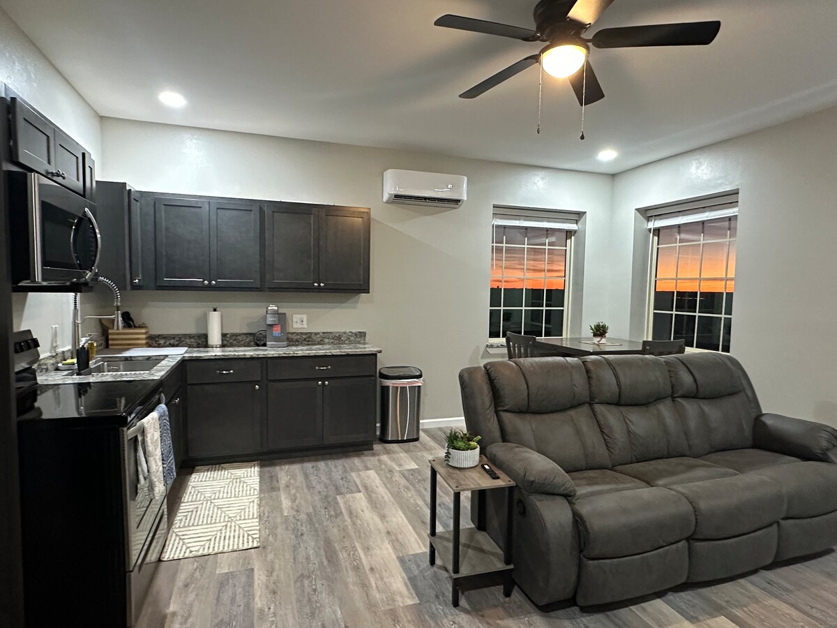 Discover this chic upper-level studio overlooking Main Street in the heart of downtown Medford. Designed with high end finishes and boutique charm, it features a plush king bed, luxe linens, sleek kitchenette, and stylish open bath. Large windows fill the space with light and offer sweeping views of downtown. Enjoy fast WiFi, smart TV, balcony, and keyless entry. Walk to restaurants, shops, and cafés—perfect for a romantic escape, business stay, or weekend getaway.
