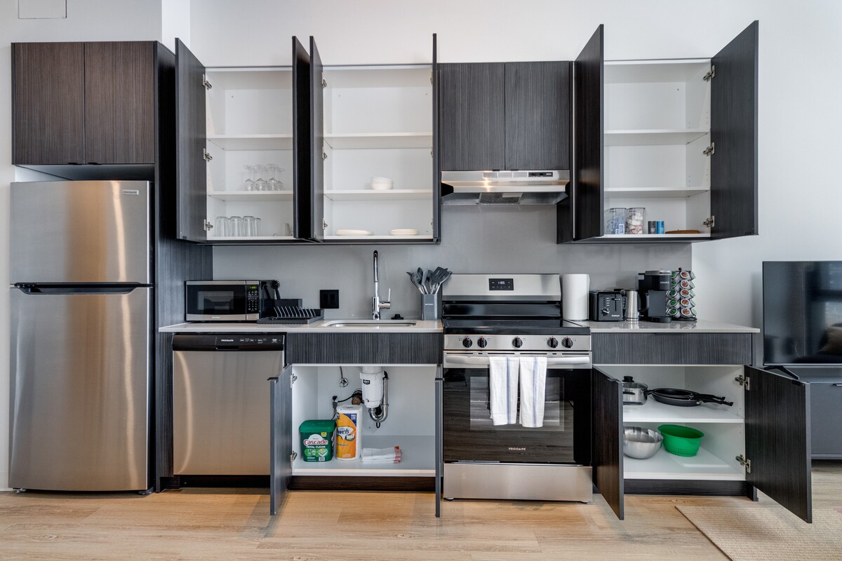 With 542 sq ft of modern, functional accommodations, our Level Suites feature a spacious studio layout with fully-equipped kitchen, open-concept living room with sofa bed, comfortable sleeping space, spa-inspired bathroom and ample closet space. Designed for comfort and convenience, all suites boast in-suite laundry, premium appliances, flat-screen TV with cable, complimentary WiFi and local calling. Space to live and play? That’s pretty suite.