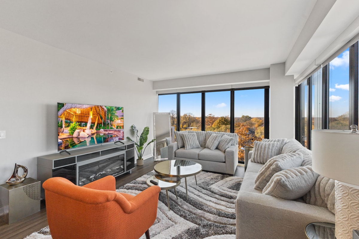 [MEGJEGYZÉS: A fő tetőterasz jelenleg felújítás miatt zárva van, és a tervek szerint 2026 nyarán/őszén nyílik meg újra.] A 2. tetőterasz továbbra is nyitva áll, és használható, beleértve a medencét is, amely általában az Emlékezés napja (Memorial Day) körül nyílik meg.] Ez a stílusos sarki lakás tökéletes helyen található, mesés kilátással a városra több irányból. Ez egy világos és tágas, két hálószobás, két fürdőszobás lakás, amelyben van egy további kanapéágy is, és ideális családok, üzleti utazók vagy együtt utazó párok számára. Az épület