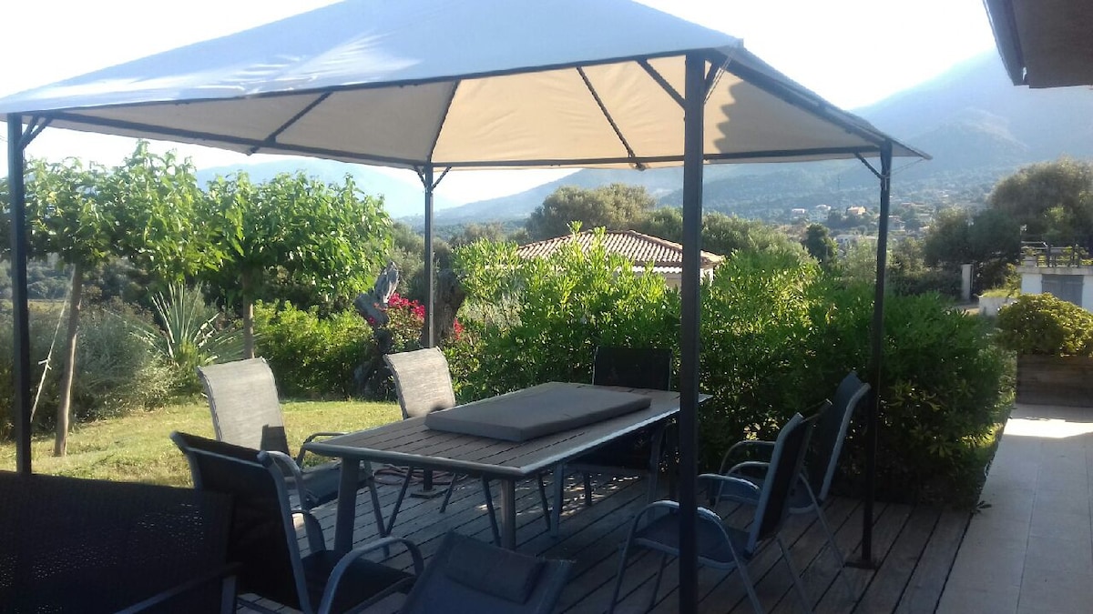 Modern, egyszintes, 120 négyzetméteres villa, amely ideális a családdal vagy barátokkal töltött nyaraláshoz békés és csendes környezetben. A villa 3 hálószobából áll fürdőszobával/vízzel, egy nappaliból álló konyhából/nappaliból, amely medencével, tűzrakóhellyel és kerti bútorokkal felszerelt teraszra néz. A teraszról kilátás nyílik a környező szőlőültetvényekre és hegyekre. Ágynemű, törölköző biztosítva Ideális helyen, 3 percre a városközponttól, a strandoktól és a mólótól, ahonnan az Ajaccioba tartó transzfer indul.