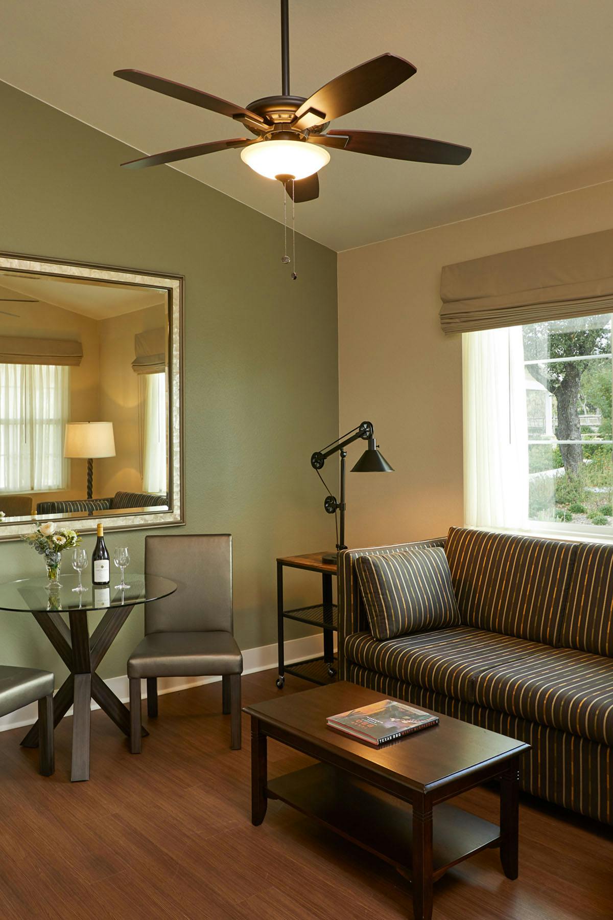 Experience peace, privacy, and panoramic views in this open-air luxury suite, nestled just a half mile from the main inn at our Texas Hill Country resort and spa. Inside, enjoy a king-sized bed, a cozy seating area with a fireplace, a comfortable desk for writing or working, and a warm, inviting bathroom. Step through the rear doors to your private covered porch, where you can sip wine, read a book, or simply take in the serene Hill Country landscape.