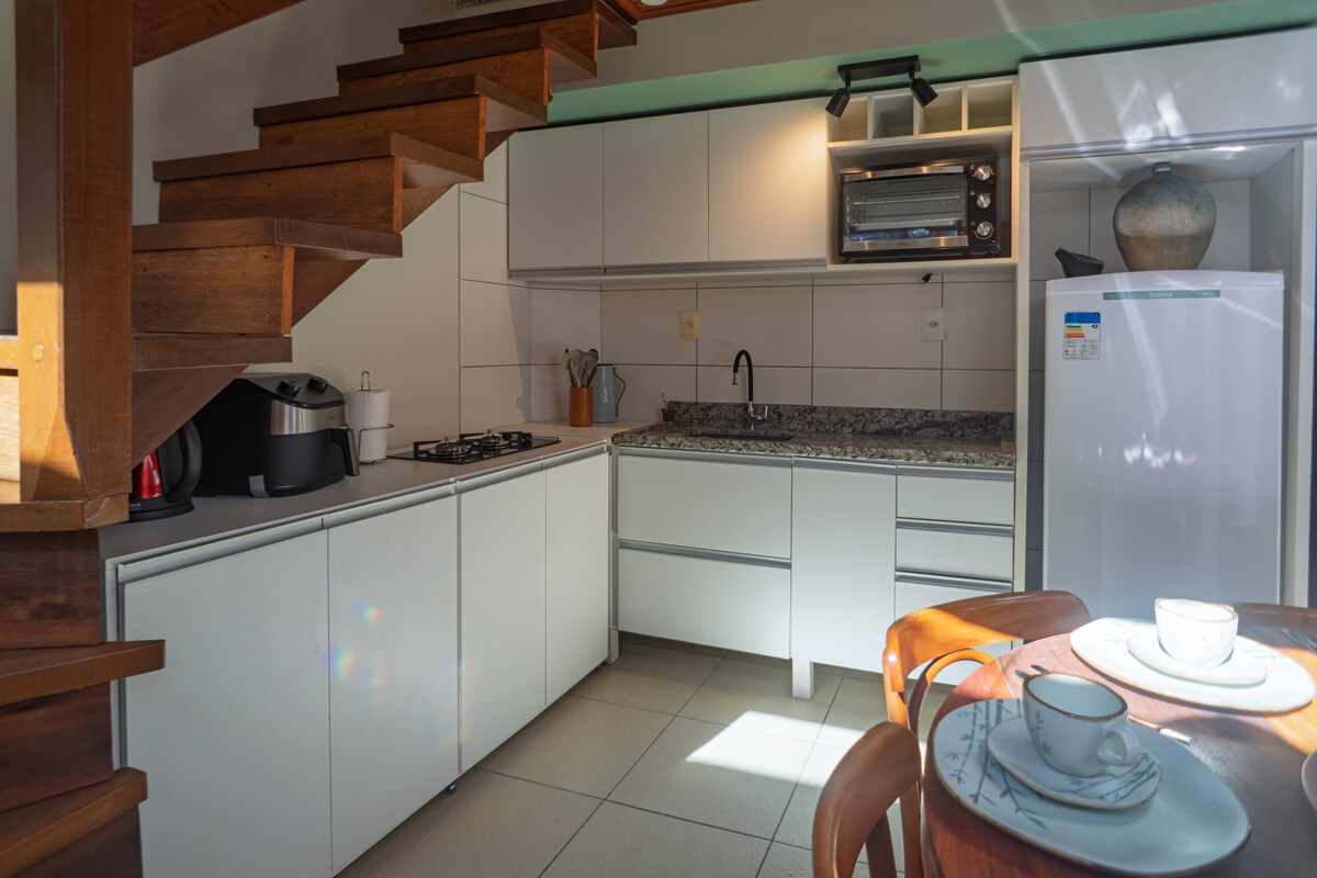 Lindo e confortável apartamento com suíte, sala/cozinha americana, estacionamento privativo para 1 veículo, localizado em condomínio fechado e bem perto da praia (50 metros). A suíte possui: TV 42" e ar condicionado split. Na cozinha: fogão, geladeira, microondas, sanduicheira, liquidificador e cafeteira. Na sala: um sofá cama. O Condomínio: em uso coletivo os hospedes poderão desfrutar de piscina, salão de festas, sistemas de câmeras, wi-fi nas áreas externas e apoio de um caseiro.