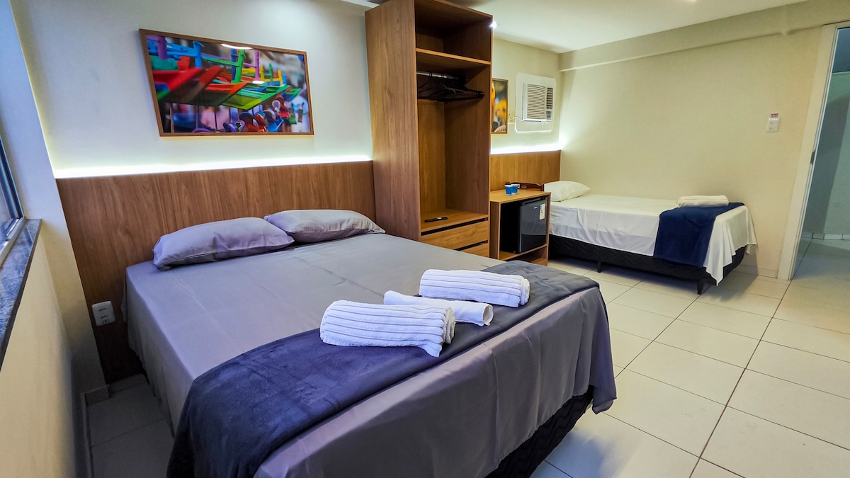 Desfrute de uma experiência premium com vista panorâmica de Belém. O Studio se destaca pela funcionalidade: a divisória com porta separa o quarto do estar, oferecendo privacidade superior. Relaxe na cama de casal ou no sofá-cama confortável (ideal para o 3º hóspede). O entretenimento é garantido na Smart TV 65", que inclui Netflix Premium no plano. A cozinha é completa e o Studio oferece chuveiro elétrico, secador de cabelo e ferro. Sua tranquilidade é completa com a garagem coberta exclusiva.