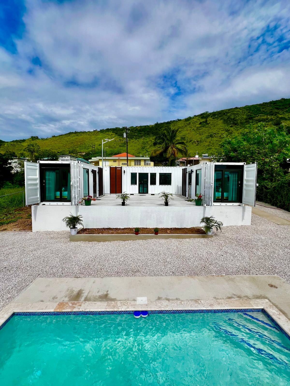 Modern családi konténerlakosztály medencével és óceánra néző kilátással