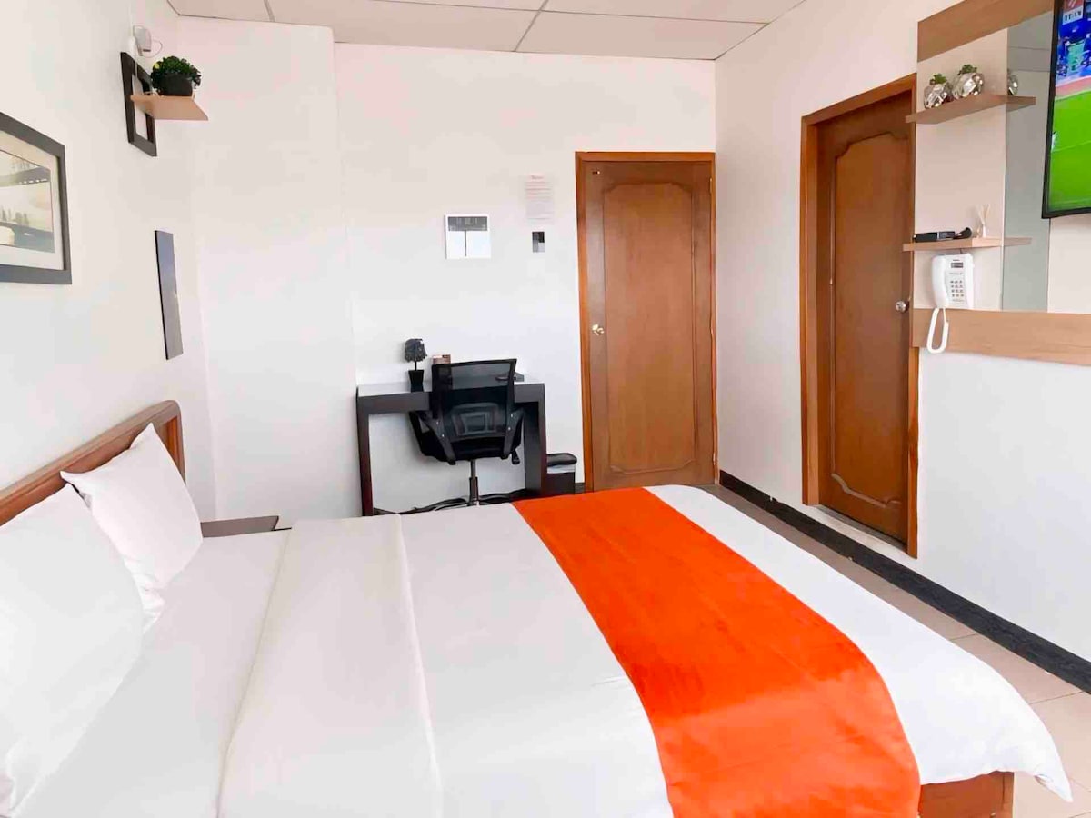 Ubicada en pleno centro de la ciudad, esta habitación combina estilo y confort. Con un diseño moderno y cálido, ofrece una cama cómoda y baño privado. Es perfecta para quienes desean una estancia tranquila y práctica cerca de las principales atracciones, mercado y parques. Incluye Wi-Fi, aire acondicionado, Tv, escritorio y un mini bar . ¡Ideal para disfrutar de la ciudad con comodidad!