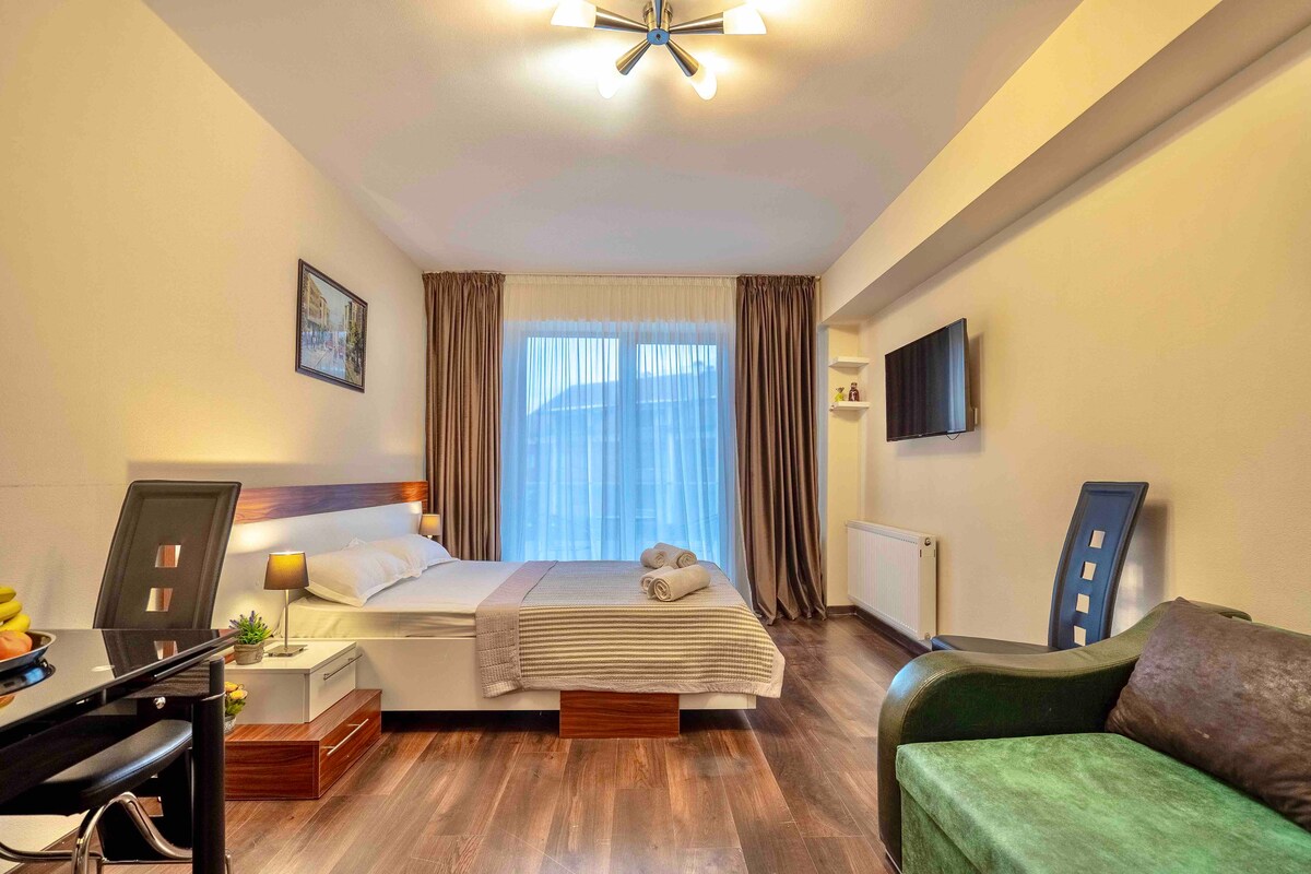 I, Roman, offer you a cozy studio in the Twins complex, New Gudauri. To the nearest rope lift Zuma 250 m (ideal for beginners and children), to the gondola Gudaura Gondola Lift - 350m. The apartment is newly renovated and has everything you need for a comfortable stay. Self-rapid check-in with an electronic lock is provided. To shops, restaurants, bars, swimming pool, ATM, playground 5 minutes on foot.
