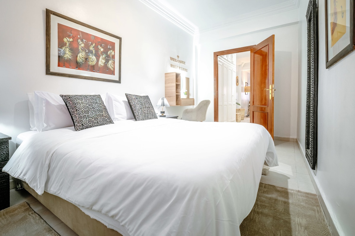 Szállj meg Marrákes szívében, a 2 hálószobás, 2 fürdőszobás lakásunkban. Élvezd a csúcsminőségű Simmons ágyneműt, a nagy sebességű wifit (száloptikás) és a modern dekorációt saját medencével. Teljesen felszerelt, teljesen felszerelt konyha, stílusos fürdőkád és olasz zuhanyzó. Egy rövid sétára a Jemaa el-Fna tértől, a Plazza tértől és a Carré Éden tértől. A medence nem fűtött. Megjegyzés: A marokkói párok nem engedélyezettek.