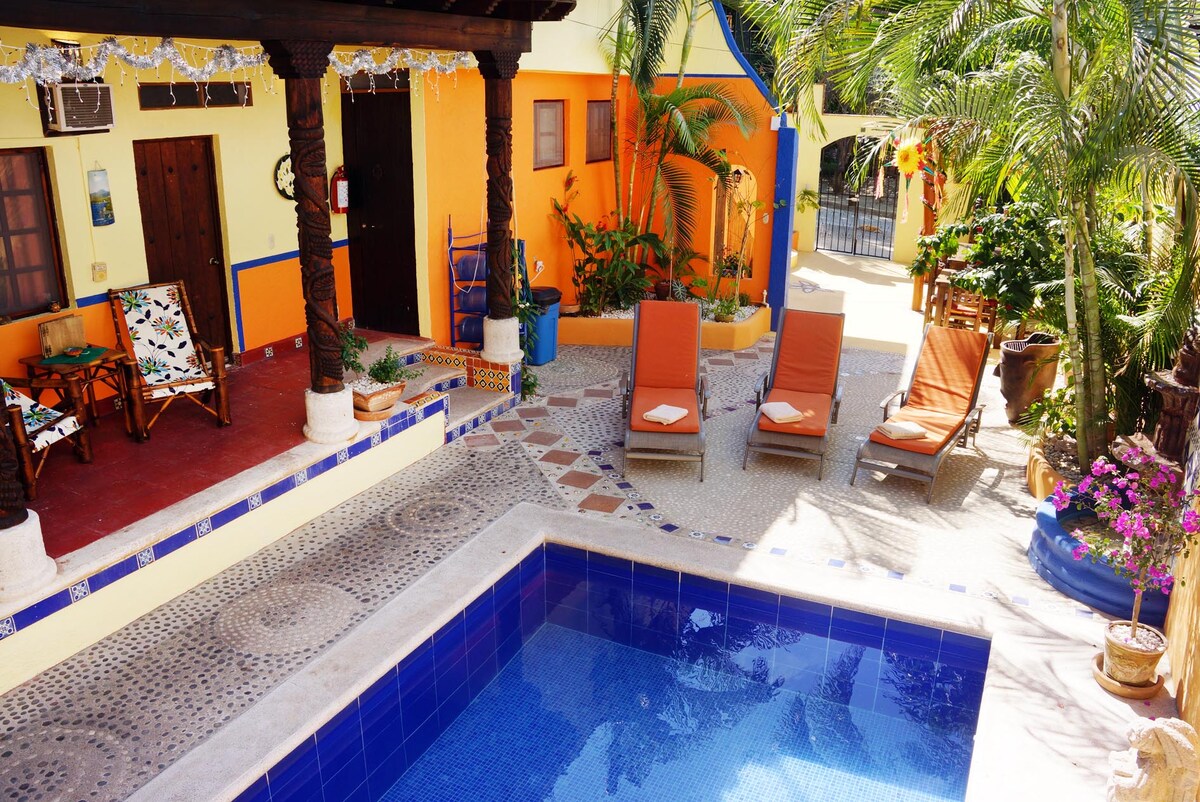 Small room counts with a bedroom with fullsize bed, its own bathroom and a minibar. The small room has use of the fully equipped comunal ktichen. fits for 2 persons About us: We are a small, family-run hotel on the beautiful Pacific coast of Mexico in the charming fishing town of Zihuatanejo Our hotel offers: 3 comfortable rooms for 2-3 persons with bathroom, minibar and comunal kitchen. 2 Apartments with 1 bedroom, bathroom, fully equipped kitchen, living and dining area, for up to 4 people. 1 Penthouse-Suite with 2 bedrooms, 2 bathrooms, a large open kitchen with bar and dining area on a spacious sun terrace with deck chairs and a hammock. All rooms are lovely decorated in traditional Mexican style with carved wooden furniture and features and count with ceiling fans,aircondition and cable TV. WIFI and purified water are available free for our guests. Just 5-10 walking minutes from the beaches 'La Madera' or 'La Ropa', or from downtown everyone finds what he needs. In downtown the vibrant life at the Central Market with its colorful variety of fresh foods as well as every kind of shops, bars and restaurants that meet almost any taste. The beaches in and round the city offer a great variety of entertaining activities such as banana boat, para-sailing, or horseback riding. Other attractions are tours for snorkeling, diving or deep sea fishing, which can be booked directly at the hotel. Peace seekers may enjoy the extent miles at the beaches of 'Playa Blanca' Playa Larga or at the lagoon in ' Barra de Potosi '. Our hotel pool area with sun loungers and a covered rest area offers you opportunity to relax with your favorite drink.