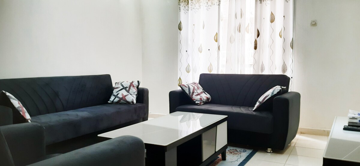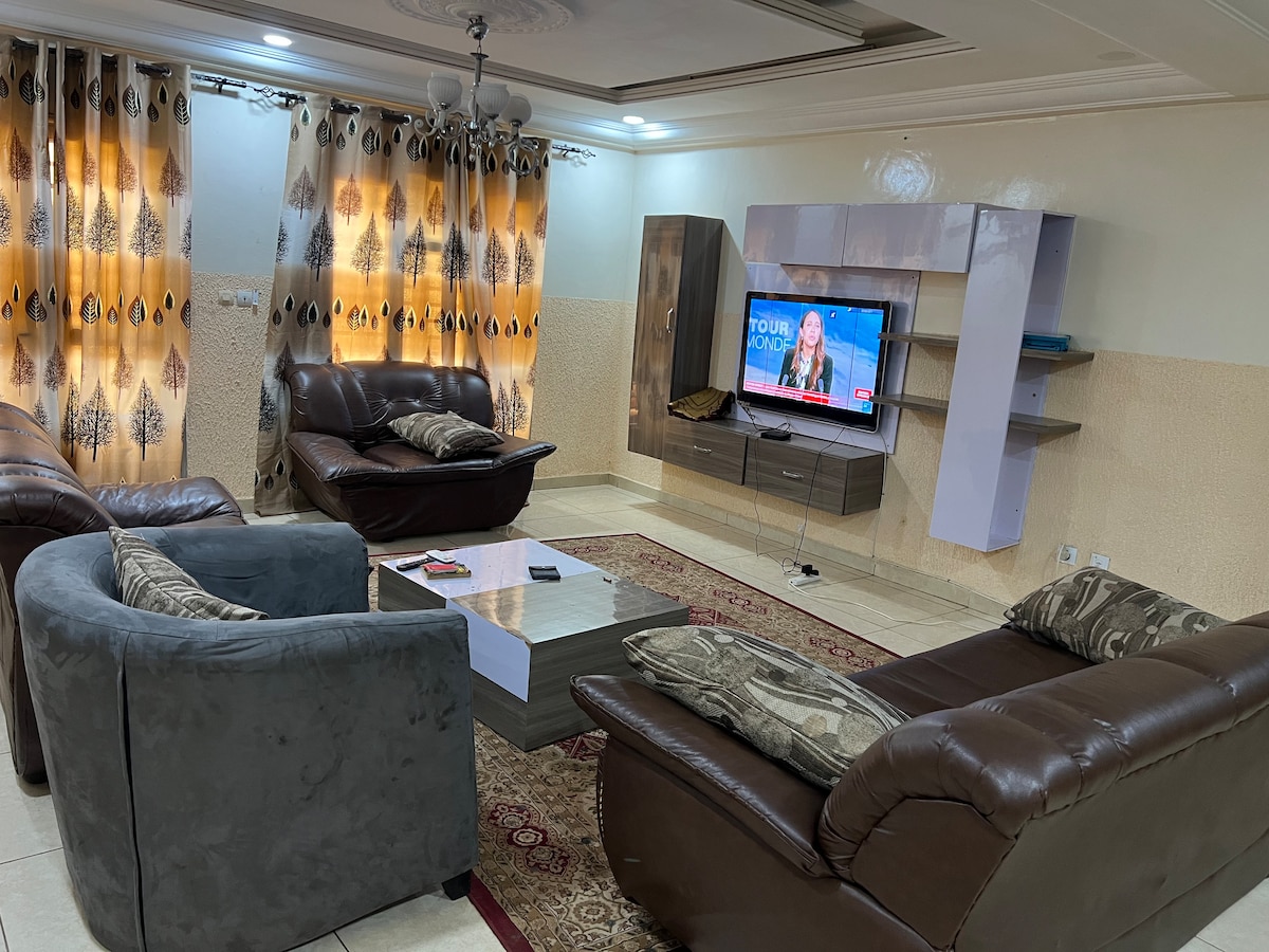 Un condominium de classe, regorgeant deux grandes chambres avec des douches internes toutes climatisées, une autre toilette pour les invités , Quatre grands balcons aux deux extrémités. Un concierge sur place pour vos besoins et des vigiles pour votre vie privée. Les visites sont autorisées par vous. L’électricité et l’eau sont couramment régulières. Pourquoi payer 300 euros à Sheraton pour une chambre tandis que vous avez toute cette panoplie pour vous. Pensez y. Nous sommes là pour vous .