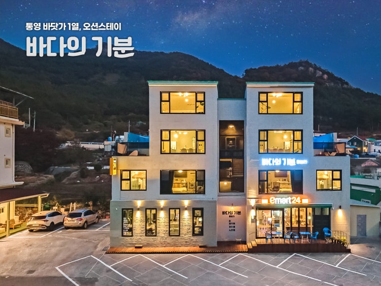 바다의기분 스테이 301 남향 복층 파노라마 오션뷰 웰니스 스위트 이 공간은 짧은 여행보다 오래 머무는 사람을 위해 설계되었습니다. 바닷가 1열에서 바라보는 다도해와 한려수도의 파노라마 오션뷰는 호수처럼 잔잔한 바다 풍경을 만들어냅니다. 복층 침실에서 내려다보는 바다는 집처럼 편안하면서도 일상에서는 쉽게 경험하기 어려운 깊은 휴식을 제공합니다. 바다를 바라보며 몸을 쉬게 할 수 있는 단독 노천 테라스와 프라이빗 루프탑 온수 인피니티풀이 준비되어 있어 하늘과 바다 사이에 머무는 특별한 휴식의 순간을 만들어 줍니다. 단, 단독 루프탑 노천탕은 4월말부터 10월말까지 오픈예정이며, 온수는 옵션으로 별도요금부과됩니다, 예약시 호스트문의. 통영시 미륵도 관광특구 초입에 위치한 바다의기분은 일상생활관련 마트나 시장, 버스터미널, 주요 관광지 차량으로 7분에서 15분내 가능하다보니, 돌아다니기보다 잘 먹고, 잘 자고, 조용히 머무는 삶의 리듬을 원하는 분들을 위한 공간입니다.
