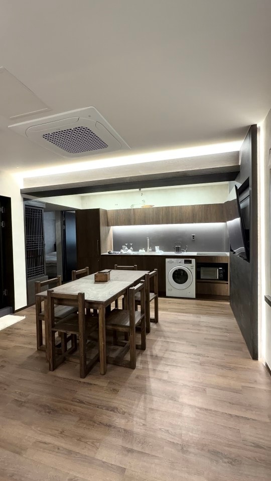 호텔 공감공간 오시리아점 디럭스 스위트 디럭스 스위트는 아파트형 구조의 넉넉한 공간과 세련된 인테리어를 갖춘 호텔 객실로, 소규모 가족이나 친구 단위 여행객에게 알맞은 선택입니다. • 객실 구성 : 방 2개, 화장실 2개 • 침대 타입 : 각 방 퀸사이즈 침대 1개 (총 2개) • 기준 인원/최대 인원 : 기준 4인, 최대 5인까지 투숙 가능 편의 시설 • 세탁기 & 건조기 완비 • 조리 가능한 주방 (식기류·조리도구 구비) • 샴푸, 린스, 바디워시 기본 제공 이용 안내 • 체크인 : 오후 4시 • 체크아웃 : 오전 11시 @@@ 필수 안내 사항 @@@ 저희 호텔은 객실 가구및 인테리어는 호실별로 상이할수 있습니다. 랜덤으로 객실이 배정이 됩니다.