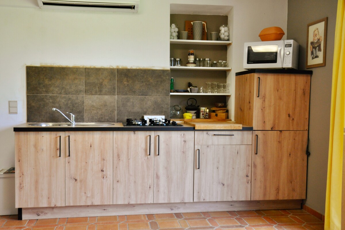 A Louvignies kastélyra néző, csendes és vidéki környezetben, Pairi Daiza közelében (8 km), különálló apartman az 1. emeleten, 32 m2-es nagy, privát TERASZSAL, L alakú NAPPALI, felszerelt konyhasarokkal, étkezővel és kanapéággyal ellátott nappalival - TV - nagy sebességű INTERNET, ZUHANYSZOBA nagy zuhanykabinnal, mosdóval és WC-vel - külön HÁLÓSZOBA 1,60 cm-es nagyméretű ággyal és kisággyal - Minimum 2 éjszaka bérleti díj, privát kültéri parkoló.