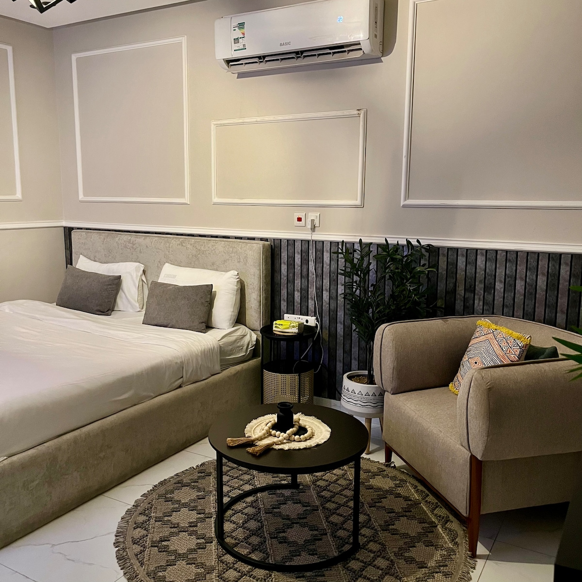 Luxus stúdió közvetlen kilátással a Bahrein-hídra és a tengerre, stratégiai helyen, a Shubaili Mall közelében. A dizájn elegáns és csendes, meleg színekkel és kiegyensúlyozott világítással, ami előkelő szállodai hangulatot kölcsönöz. Az alvóhely luxusággyal és modern dekorációval van felszerelve, fa térelválasztóval, amely privát szférát és magas szintű dizájnt biztosít. A munkaterületet egy bőrkanapé és szőrmebútorok teszik kényelmessé, amelyek meleget kölcsönöznek a helynek, emellett egy rendezett munkaterület/feldolgozó terület is van LED-es tükörrel, valamint beltéri növényekkel, amelyek különleges hangulatot és kifinomult karaktert kölcsönöznek a helynek. A hely tökéletes azok számára, akik kényelmet, magánéletet és jó ízlést keresnek egy kis családnak, valamint azoknak az utazóknak, akik más szállásélményre vágynak, és közel szeretnének lenni minden szolgáltatáshoz.