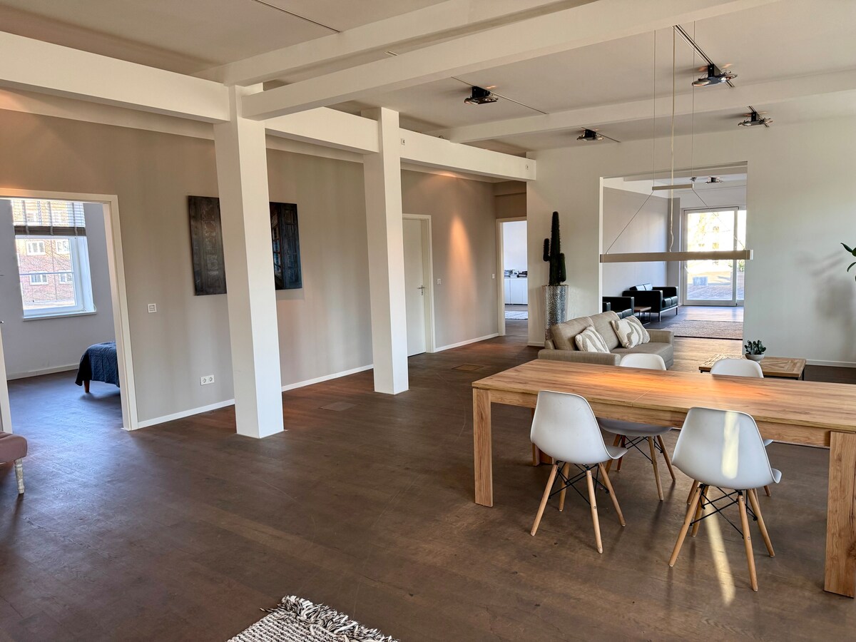 Egy régi gyárépületben, Hamburg közepén található ez a gyönyörű hely 260 négyzetméteren. Fényes betonpadló, régi gyárablakok, egy New York-i loftlakásra emlékeztető ívelt mennyezetek várnak a hamburgi tartózkodásodhoz. - Három különálló hálószoba (függöny nélkül) - Nyitott konyha több ember számára - Nagy szoba 20 méter hosszú kisebb eseményekhez - Vonattal 14 perc alatt / Hamburg központja - Autóval 7 perc alatt az Außenalsterben