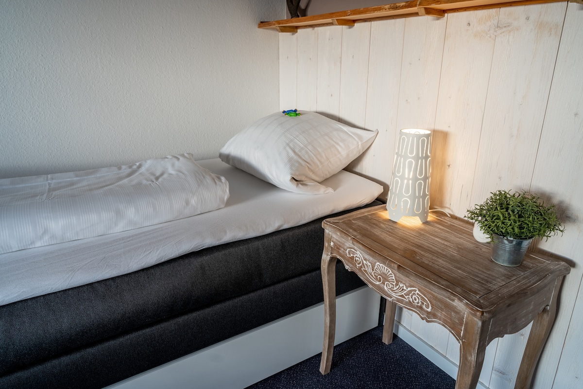 Unser Familienzimmer ist mit vier Betten ausgestattet. Es verfügt über einen Kleiderschrank und einen Schreibtisch. Das Zimmer ist mit WC / Dusche ausgestattet. Eine kleine Küche mit Kühlschrank und zwei Kochfeldern ist vorhanden. Alle Zimmer sind mit 32 Zoll Flat TV ausgestattet, WLAN ist auf den Zimmern kostenfrei verfügbar.