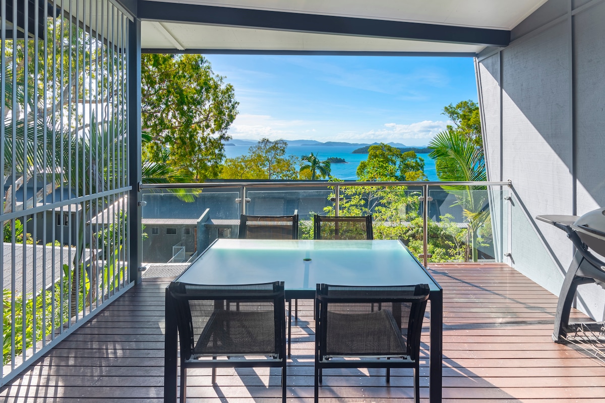 Tarts egy kis szünetet, és lazíts ezen a békés szigeten. Teljesen felújított (2023. augusztus) modern, 1 hálószobás, teljesen önálló lakás, amely tökéletes a Whitsunday Passage-ra néző párok számára. A naplementék látványosak! Hálószoba - franciaágy és 2 erkély. Vadonatúj, modern konyha és mosoda. Kényelmes, 3 férőhelyes elektromos fekvőhelyes társalgó TV-vel és netflix-előfizetéssel teszi az estéket a kikapcsolódásra és a kikapcsolódásra. Az erkélyen található grillező, étkező- és nyugágyak egy trópusi paradicsomba vonzanak.