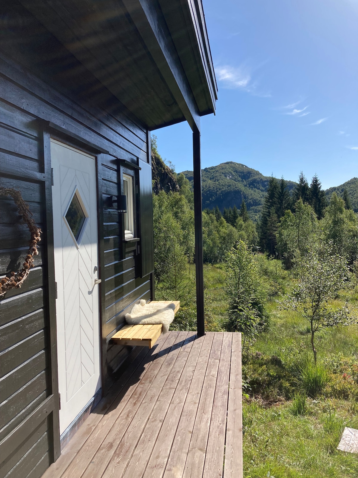 Utsikt. Lekker hytte ved innsjø