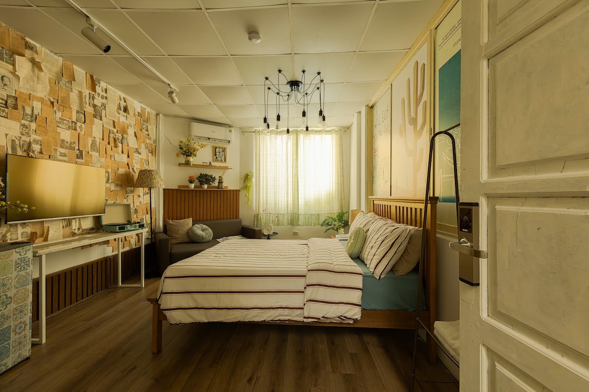 A Cactus Room egy hangulatos és művészi elvonulás Hanoi szívében, amelyet melegséggel és kreativitással terveztek. A szobában kényelmes ágy, stílusos kanapé és kézzel készített dekoráció található, amely minden sarokba karaktert visz. A napfény átszűrődik a lágy függönyökön, kiemelve a vintage falakat és az egyedi műalkotásokat. Az átgondolt részletekkel, szobanövényekkel és bájos légkörrel rendelkező Cactus kényelmet és inspirációt kínál a szálláshelyen töltött időd során.