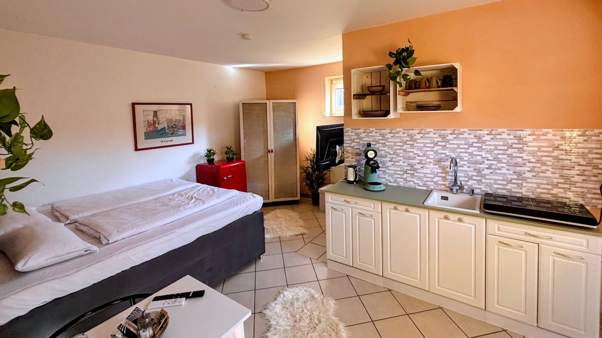 Házunk bővítésében, amelyet korábban rendelőként használtak, ez a stúdió kizárólagos, privát használatra áll rendelkezésre. Egy kis folyosó mellett cipősszekrénnyel és ruhásszekrénnyel van egy kis fürdőszoba WC-vel és zuhanyzóval. A nagy, világos nappaliban van egy kis konyhasarok (de nincs teljesen felszerelt konyha) mosogatóval. Egy kihúzható kanapé egy harmadik személynek is helyet biztosít. Egy közepes magasságú válaszfal mögött a kétszemélyes ágy közvetlenül a nagy ablaknál van.