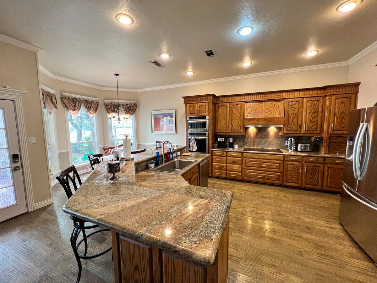 Nagy, modern családi McMansion! Tökéletes bármilyen eseményhez! 20 percre a Stockyards és a DFW repülőtértől! A ház teljesen felszerelt konyhával, gáztűzhellyel, valamint ingyenes kávéval és snackbárral rendelkezik. Szabadtéri nappali, konyha és könyvtár fent. 5 hálószoba és 4,5 fürdőszoba a csoportodban bőven lesz hely szétszóródni! Igyál kávét, és élvezd az erkélyen, ahonnan kilátás nyílik az ingatlanra és a távoli belvárosi FW látképre. A pörkölés a tűzrakóhelyen kívül, ingyenes fával és smores készlettel!