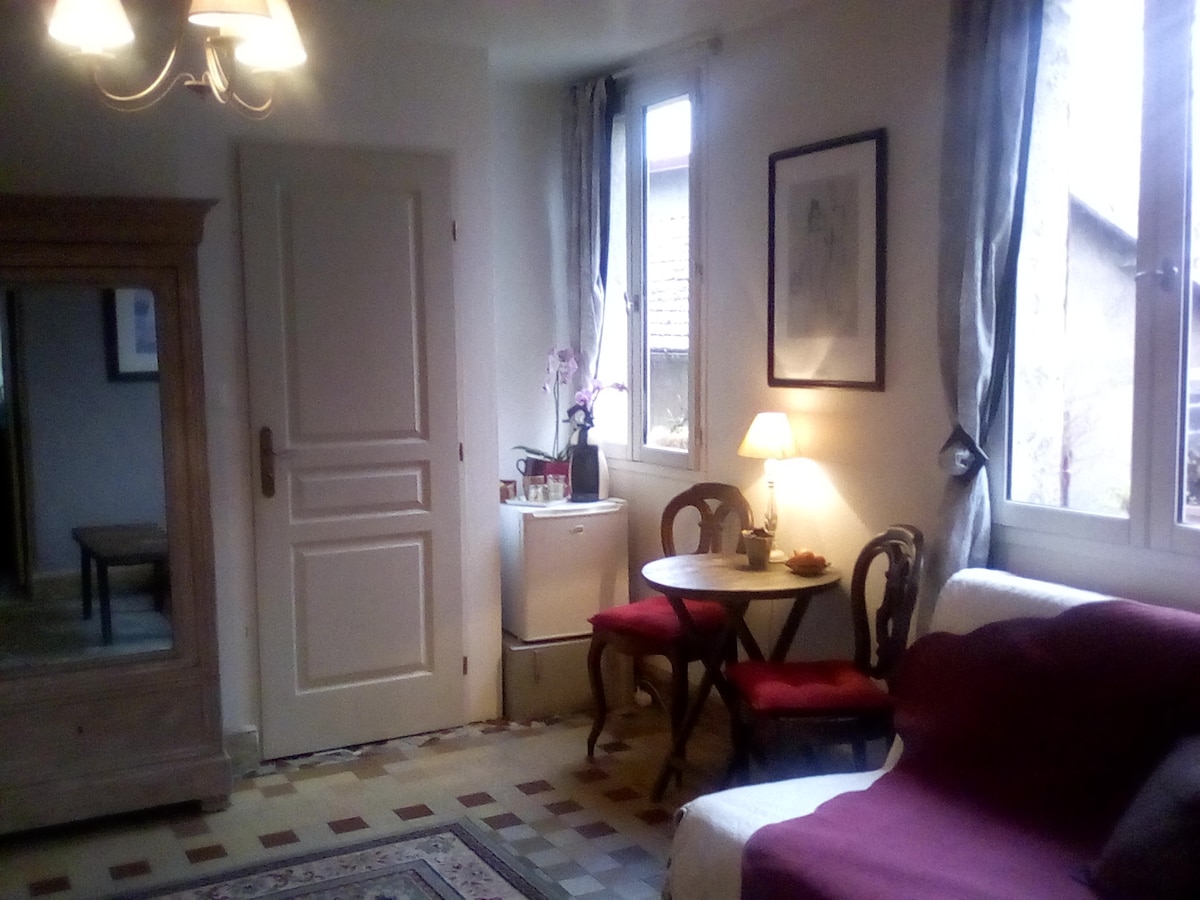 Bájos, felújított, 27 m2-es stúdió felszerelt konyhával, zuhanyzóval és külön WC-vel. Étkezőasztal 2 székkel és irodaterülettel. Lapos képernyő. Nagy franciaágy 160 x 200. Ágynemű kérésre. Ingyenes parkolás.