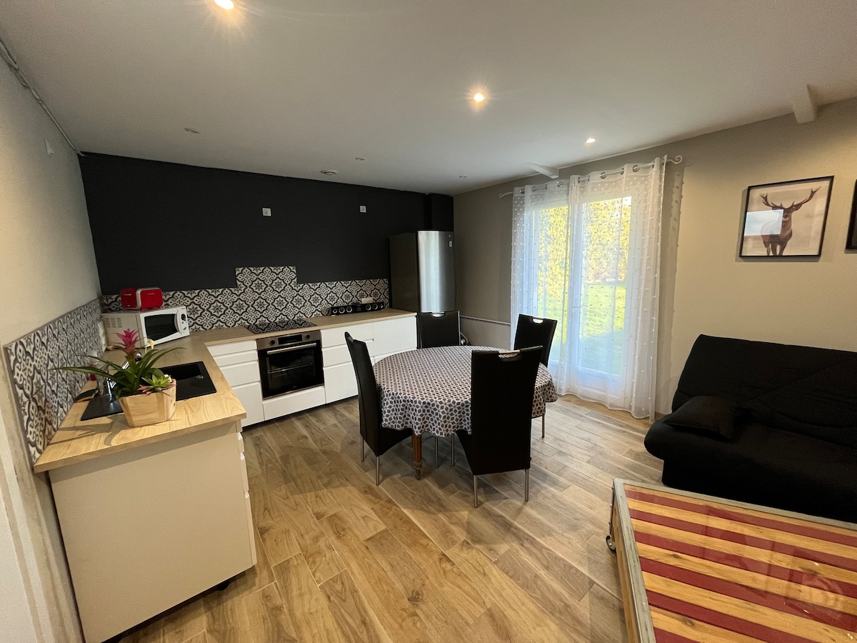Amusez-vous avec toute la famille dans ce logement chic à 10 minutes de Nigloland en voiture et proche des grands lacs. annexe indépendant de 90 mètres carrés comprenant une cuisine ouverte avec une salle de bain moderne une chambre parentale au niveau de la mezzanine une grande chambre enfants avec un lit double et deux lit simple grande cours partager et fermé lieux calme et paisible pas de location pour fête et soirée festive !!