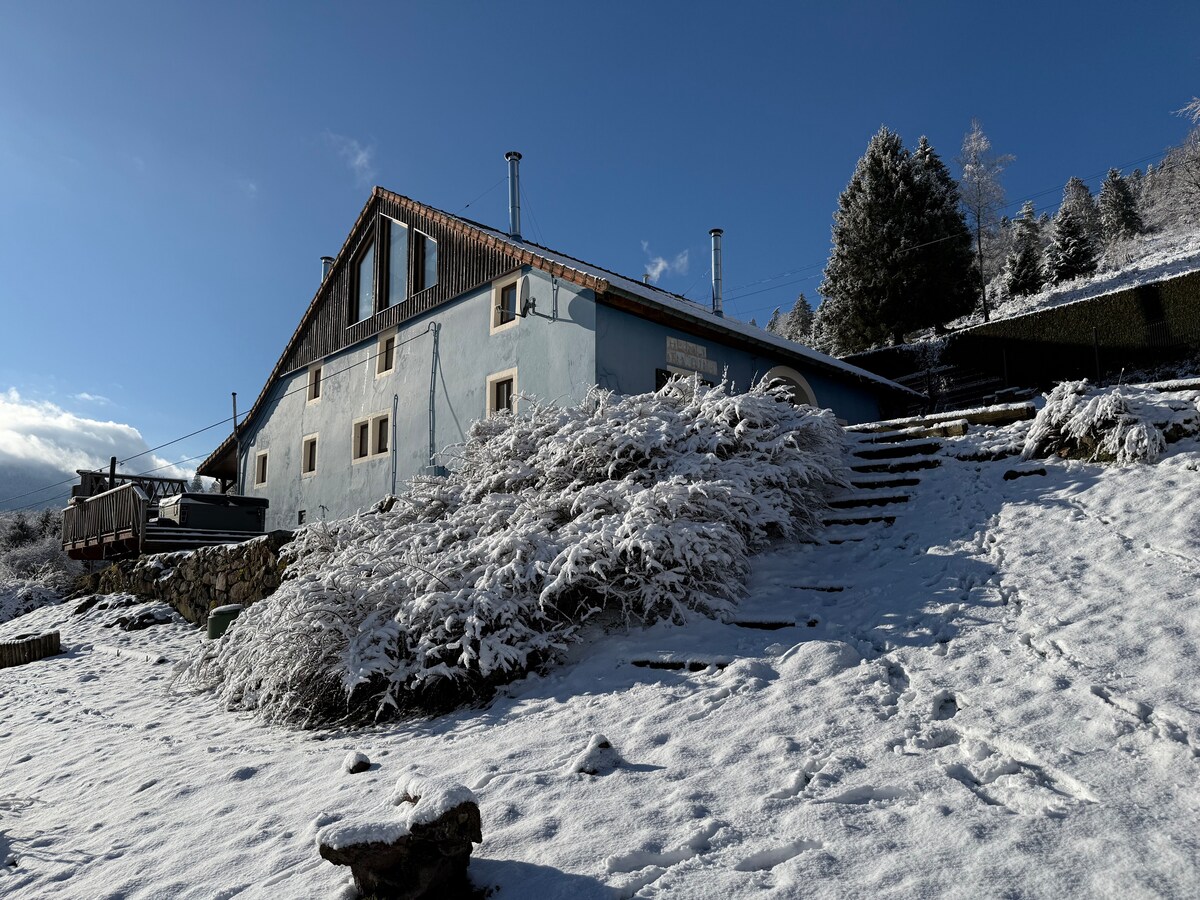 Need a holiday, relaxing, sporting, exotic. Look no further ... La Maison Bleue opens its doors and can accommodate up to 10 people. Perched 600m above sea level, overlooking the Moselle valley, surrounded by forests and fed by spring water from the mountains, you will find yourself in a cocoon of well-being with a breathtaking view of the Ballon d'Alsace. Light the wood stove and the magic operated by the sound of the stream running through the land.