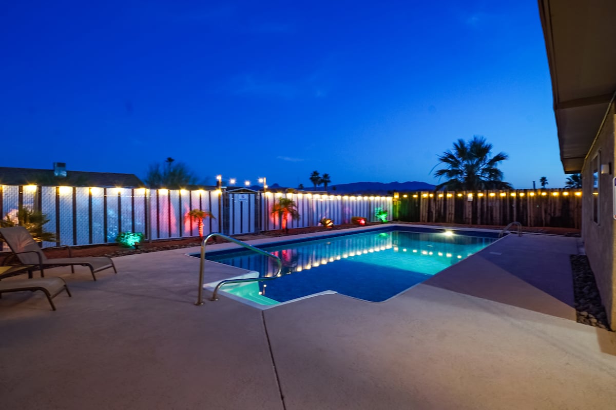 Üdvözlünk az Ace of Oasisban, egy világos és tejes nyaralóban, amely saját hátsó udvarral, medencével és a hegyekre nyíló kilátással rendelkezik! Az otthon központi helyen található, és perceken belül elérhető a Havasu-tó, a golf, a kaszinó és a London Bridge étkező- és szórakoztató negyed. Nincs kedved elhagyni a házat? Élvezd a föld alatti medencét (fűtés opcionális), a medencés szoláriumot, a fényhatásokat, az egyedi pezsgőfürdőt, az árnyékos teraszt, a grillezőt és a csocsót. Pihenj benne modern dekorációval, internettel és Smart TV-vel minden szobában.