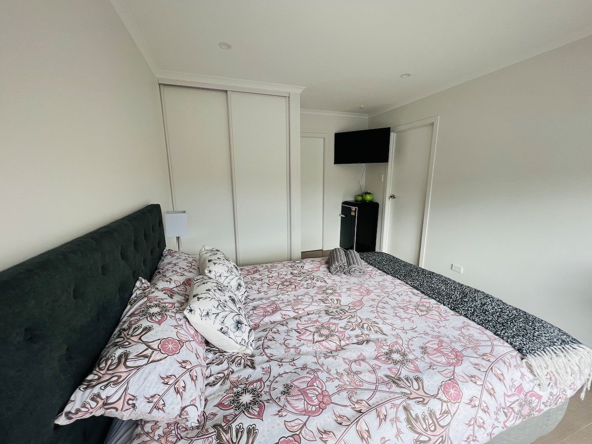Lovely bright Studio ,garden outlook, private entrance &ensuite . Parking . Kitchenette,Tea /coffee making,microwave ,toaster ,fridge, induction hob,pots ,cutlery,dishes,glasses,Wifi ,TV Double bed quality mattress & topper, down duvet , desk and chair,huge closet with luggage space , wall heater, Homemade meusli starter breakfast with fruit on arrival. .I offer espresso coffees 8 to 9 am Note Ensuite is a wetroom with toilet,shower ,basin, fully tiled , drains normally.