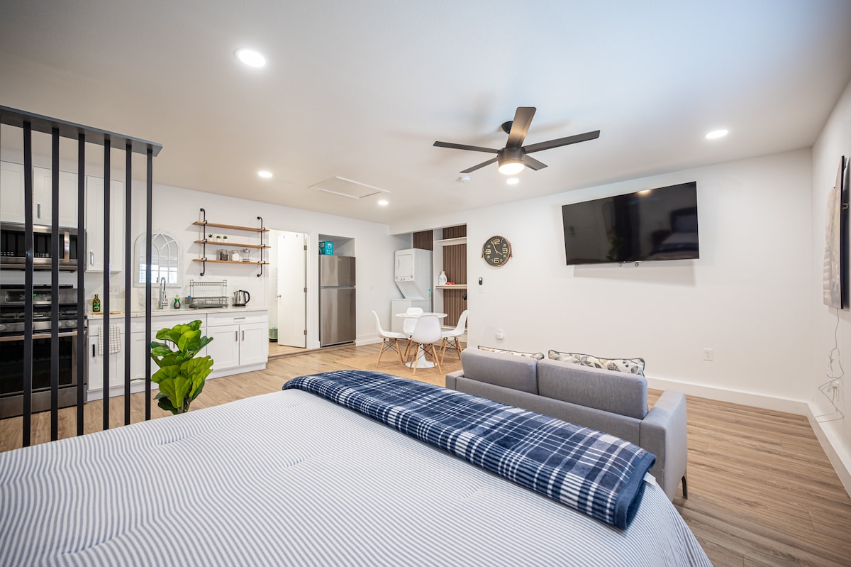 Gyönyörű, egyedi, 1 hálószobás, csúcskategóriás privát egység külön bejárattal és parkolással. Egy csendes környéken fekszik, ahonnan könnyen elérhető minden kényelmi szolgáltatás - 5 percre a McCarran repülőtértől és 8-10 percre a Strip-től. Keményfa padlók, boltíves mennyezet, egyéni fapultok és étkezőpultok, teljesen felszerelt konyha, modern, tágas fürdőszoba, 50colos 4K TV wifivel, franciaágy az 1-es hálószobában, teljes méretű alvókanapé a nappaliban.