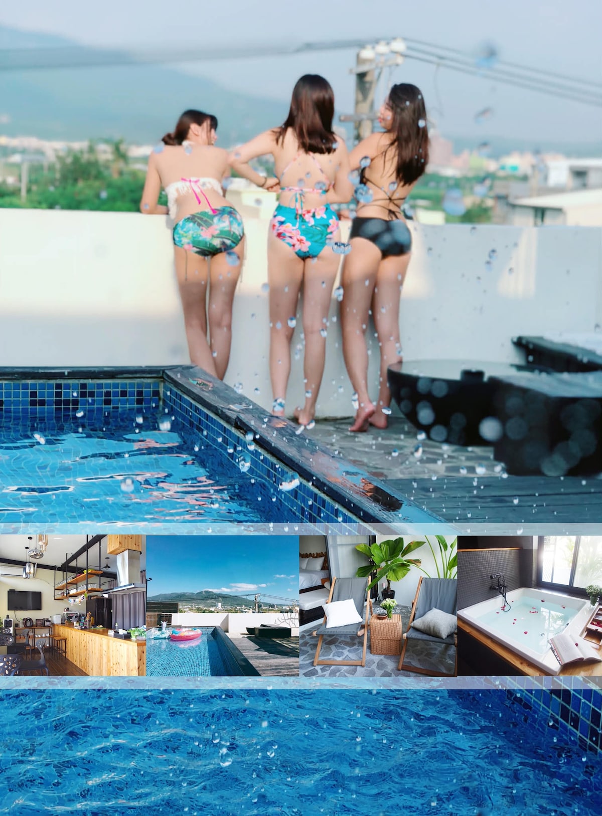 Peninsula inn 共3層樓4房 1F 私人泳池雙人房*2 2F 家庭四人房*2 3F 廚房/麻將KTV/戲水池烤肉區 包層含『2F兩間四人房』及3F公共區域PM6:00後獨享,可另外加購早餐及下午茶。 PS:私人泳池主題房可另外預約,2-4人,含一泊二食/紅酒/SPA,請找「坐沙發上」照片,可連 絡 我們。 ____________________ Peninsula Inn has 3 floors and 4 rooms. 1F: 2 Private Pool Double Rooms 2F: 2 Family Quadruple Rooms 3F: Kitchen/Mahjong Table/KTV/ Pool/BBQ Area This listing includes the entire floor: two Family Quadruple Rooms on the 2nd floor and the 3rd floor wading pool and facilities for exclusive use after 6:00 PM.
