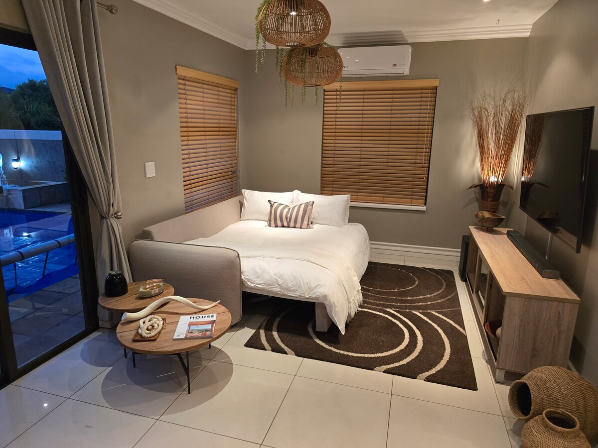 Nemrég felújított kisház a medence mellett, kétszemélyes ággyal, társalgóval és saját braai területtel, konyhával, kanapéággyal és munkaállomással. ✔ Medence a buja kert ✔ mellett 50 Mpbs + WiFi ✔ Smart TV Netflix ✔ Árnyékolt parkoló két jármű számára ✔ Munkaterület ethernet csatlakozással ✔ Mosógép ✔ Mosogatógép ✔ Hűtőszekrény ✔ Gáztűzhely ✔ Mikrohullámú sütő ✔ Teljesen feltöltött konyhai eszközök. Központi helyen található, közel minden kényelmi szolgáltatáshoz. Három ember számára alkalmas. Hosszú távú tartózkodásra is alkalmas.