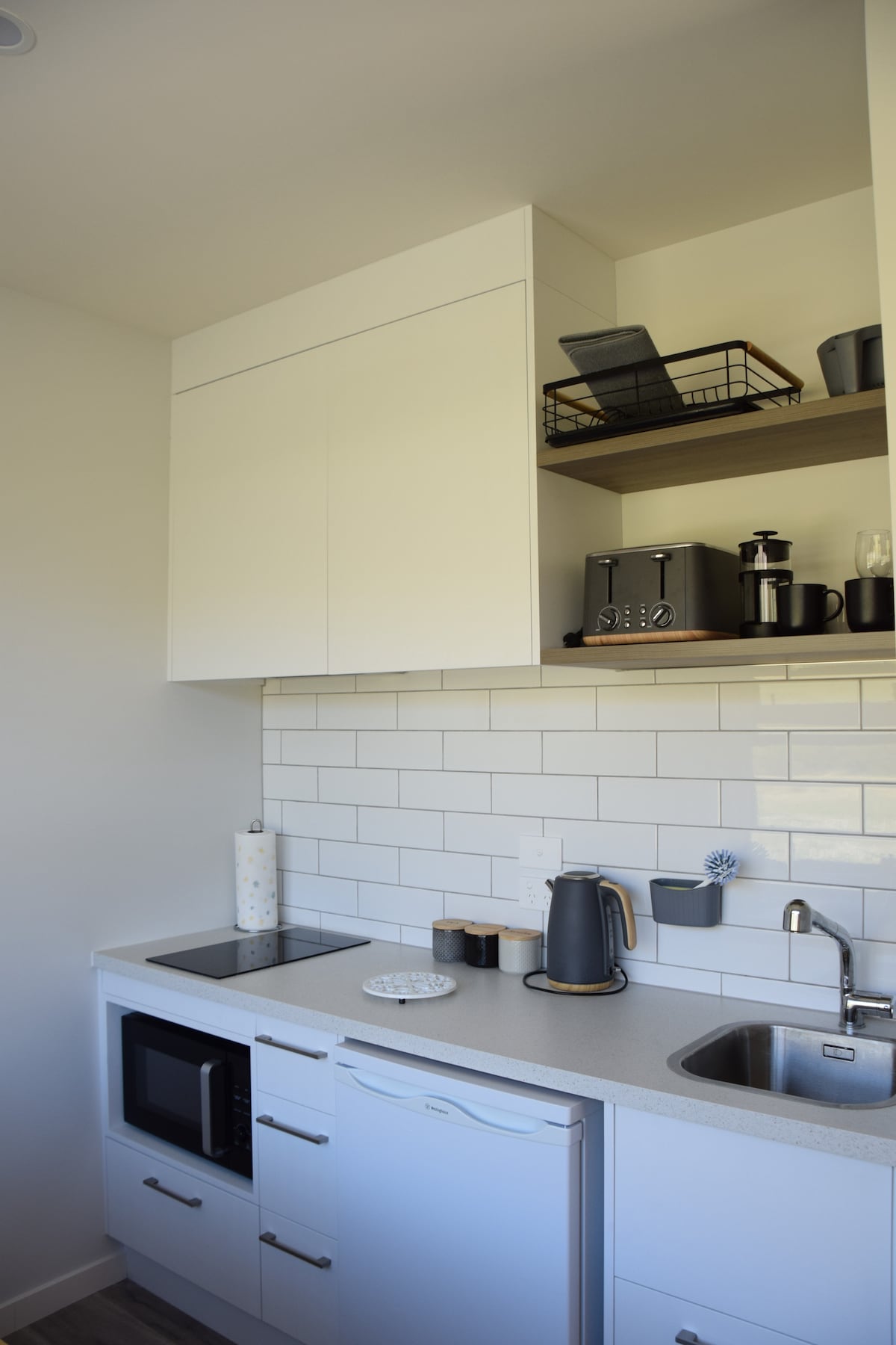 Our Self-Contained Apartment is fitted with modern furnishings, free WiFi and views across the ocean to the Nugget Point Lighthouse from the sliding doors. There is a private deck with a table and seating. The living area has a sofa, dining table and chairs and a flat-screen Smart TV. It has a kitchenette with a stovetop, microwave, electric fry pan, fridge, jug, toaster and all the essentials. The bathroom has a walk-in shower. It has a private entrance and off-street parking.