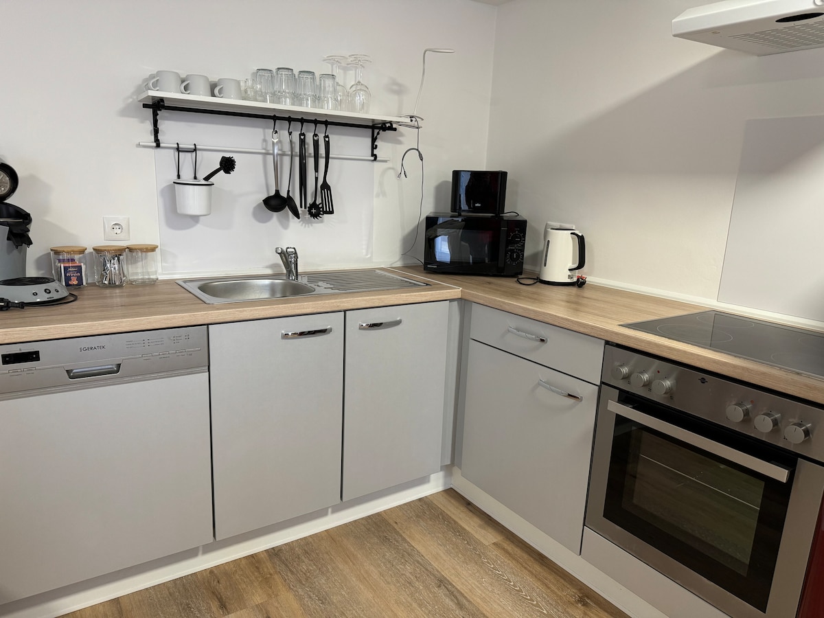 A Rajna közvetlen közelében (5 perc), és közvetlenül a Bonn központjában, a modern lakás szívében található a Beuel kerületben, egy csendes mellékutcában. Könnyedén parkolhat a földalatti parkolóban. Használja az erkélyt, a modern konyhát vagy a Sky programokat a TV-ben (Bundesliga :-) Személyszállító komppal vagy gyalog (15 perc) vagy villamossal (2 perc) gyorsan eljuthat Bonn belvárosába. Az S-Bahn [külvárosi vonat] a repülőtérre vagy Kölnbe 10 perces sétával elérhető.