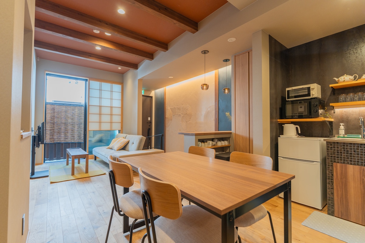 A Kyomachiya Private Lodging "Takasegawa Shichijo" egy teljesen felújított, 115 éves kyomachiya. A kyomachiyát, amely Kiotó gyönyörű tájképét alkotja, magas légzárási és hőszigetelési teljesítményű épületté alakították át, hogy kényelmesen tölthesd az időt a Kiotóra jellemző párás nyarakon és hideg teleken, miközben az eredeti szerkezet megmaradt. Az első emeleti japán stílusú szobából láthatod a tsubo kertet (a teaszobába vezető kertet) egy „roji” képpel. Emellett a folyosón is elhelyeztünk egy kanapét, hogy pihenhess, és élvezhesd a tsubo kert kilátását. Este pihenhetsz, miközben a megvilágított tsubo kertet nézed. A 2. emeleten 2 hálószoba található, az egyikben 2 egyszemélyes ágy, a másikban 1 kétszemélyes ágy található. Ha 5 vagy több vendég van, előkészíthetünk egy futont az 1. emeleti japán stílusú szobában, és hálószobaként használhatjuk, bár ez egy kis kényelmetlenséggel jár. A konyha főzőedényekkel és edényekkel van felszerelve az egyszerű főzéshez.