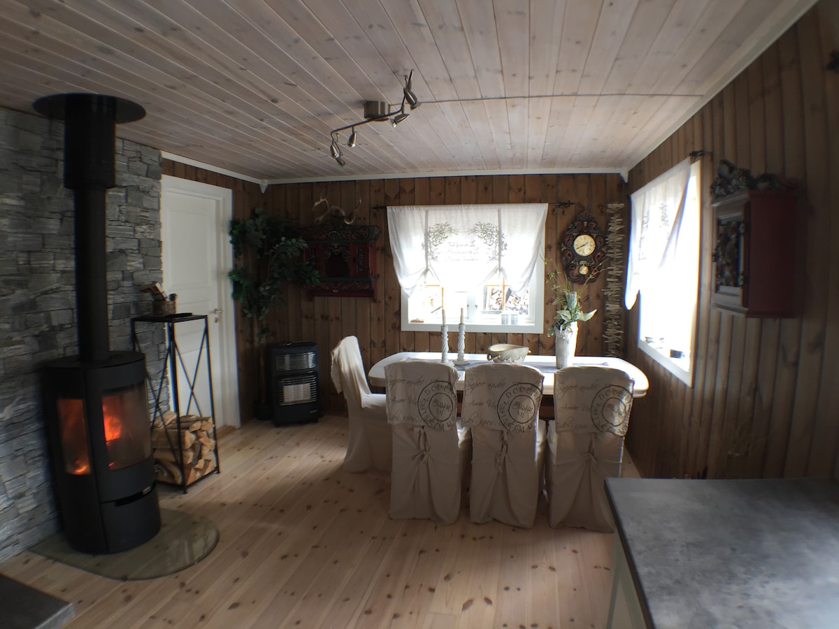 Kisház csendes környezetben, a Jotunheimen kapujában. 1. emelet: Konyha kávéfőzővel, indukciós sütő, mosogatógép és kombinált hűtőszekrény/fagyasztó. Nappali kandallóval, kanapéval és étkezővel. TV Altibox-szal. Hálószoba franciaággyal. Fürdőszoba vécével és zuhanyzóval. Törölköző biztosított. Alagsor: Fürdőszoba vécével, zuhanyzóval és mosógéppel. TV-szoba Altibox és kanapéágy. Padlófűtés. Hálószoba franciaággyal. Nincs lezárva a szoba. Fiber 80 Mbps. Dönthetsz úgy, hogy te magad végzed el a takarítást, vagy megvásárolhatod a 700 NOK,-