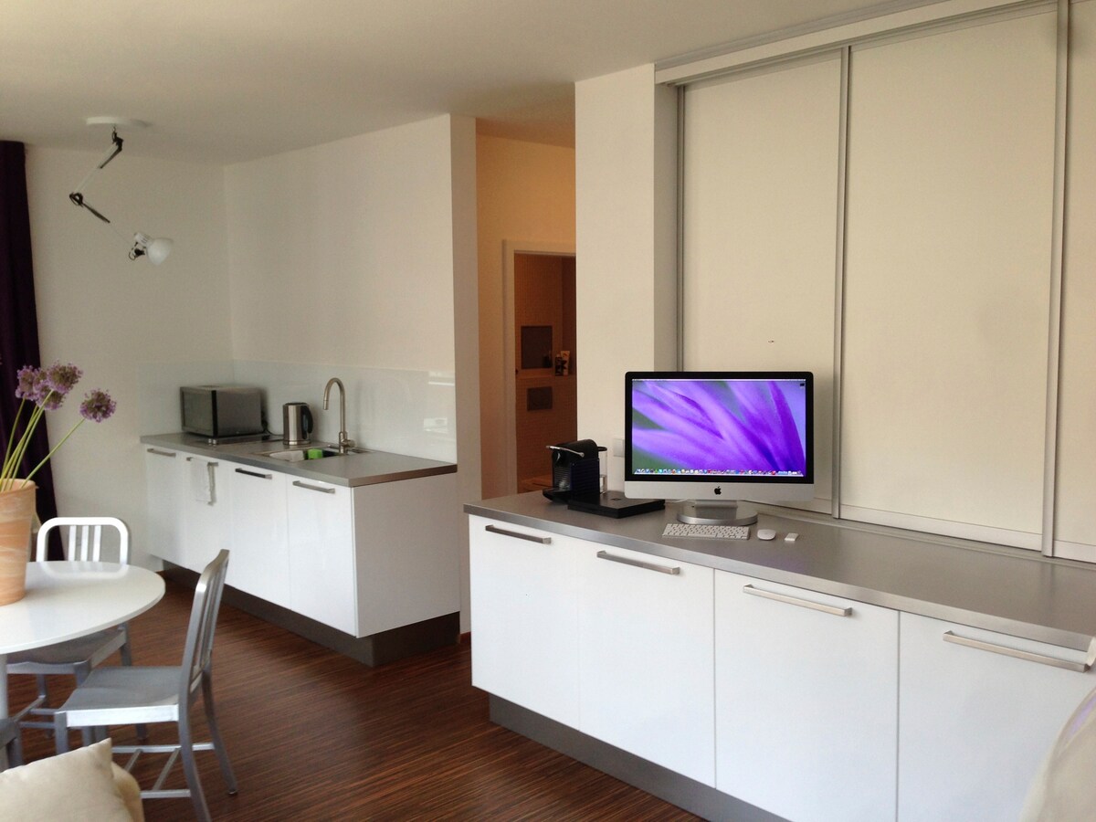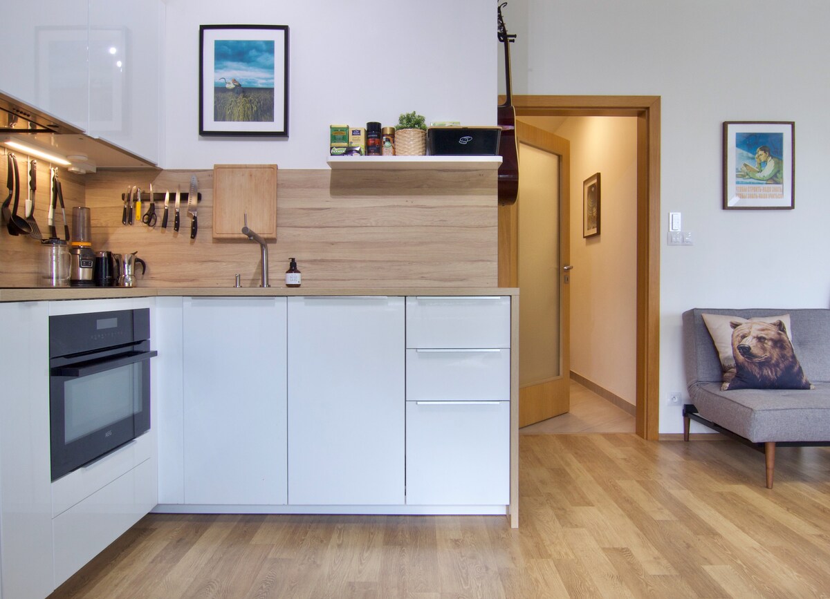 Frissen felújított és gondosan berendezett kétszobás lakásom fapadlóval és nagy, új ablakokkal, egy jól karbantartott udvarra néző fákkal, gyeppel és ülősarokkal, modern designnal, valamint a kincsvadászatból származó darabokkal szerte a világon. A hely egy élénk környéken található, mindössze 10 percre Prága belvárosától. Élvezheti a kényelmes franciaágy, pihenjen egy kanapén, vagy néz kábel TV a nappaliban, készítsd el az ételeket egy jól felszerelt konyha.