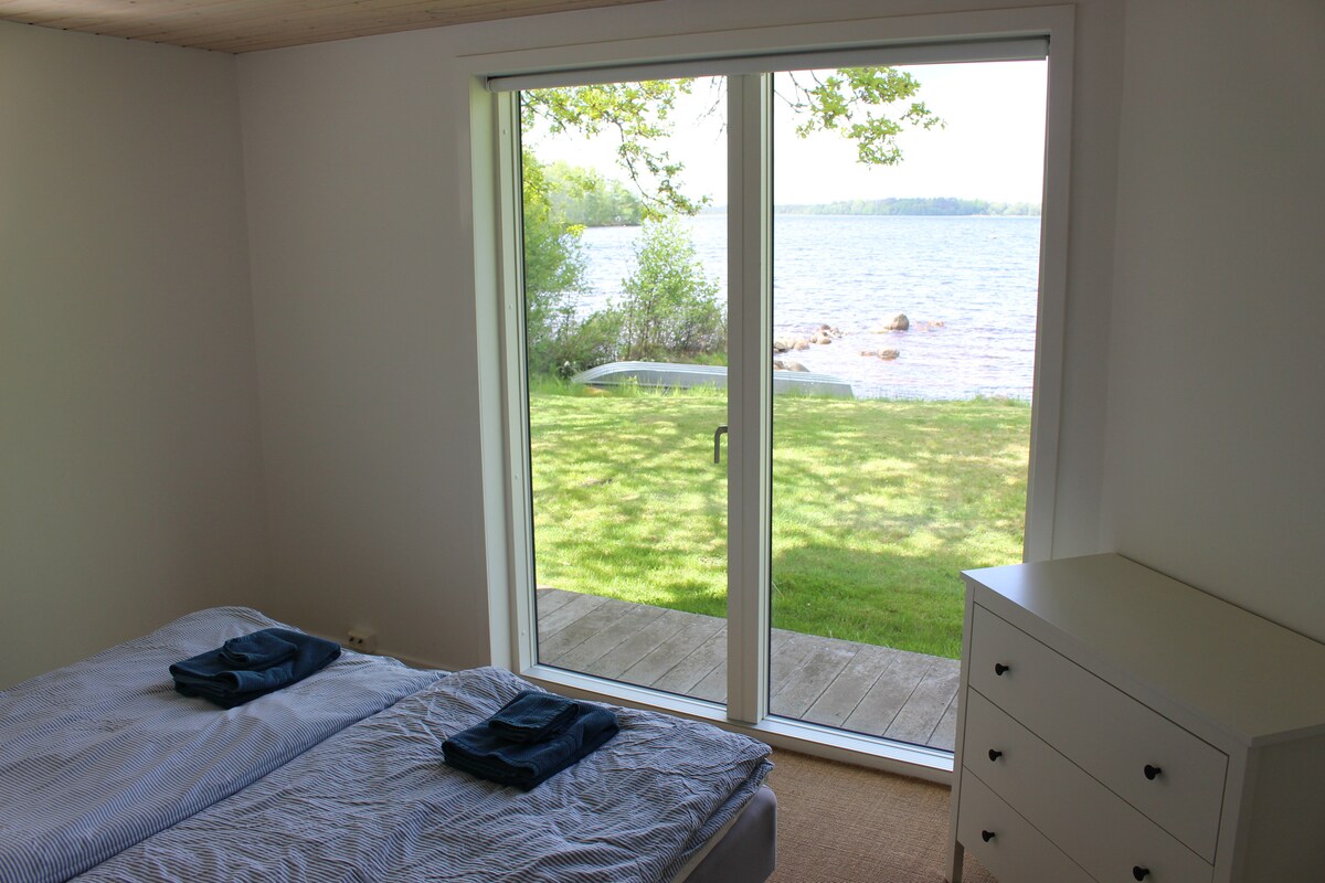 Experience the Småland idyll Ramnäs. With a 5-minute walk to the beach where you can enjoy the sun/swimming, fishing, canoeing. Around the knot, there is the forest for those interested in the outdoors, Ikea Musem 1.7 km away. Our cozy newly built cottage with plenty of space to hang out, 3 bedrooms offers 7 sleeping places. Hot tub on the terrace, sauna and a lovely outdoor grill and pizzaowen for a cozy hangout. The rent includes 1 canoe for 3 per person, and bicycles to borrow.