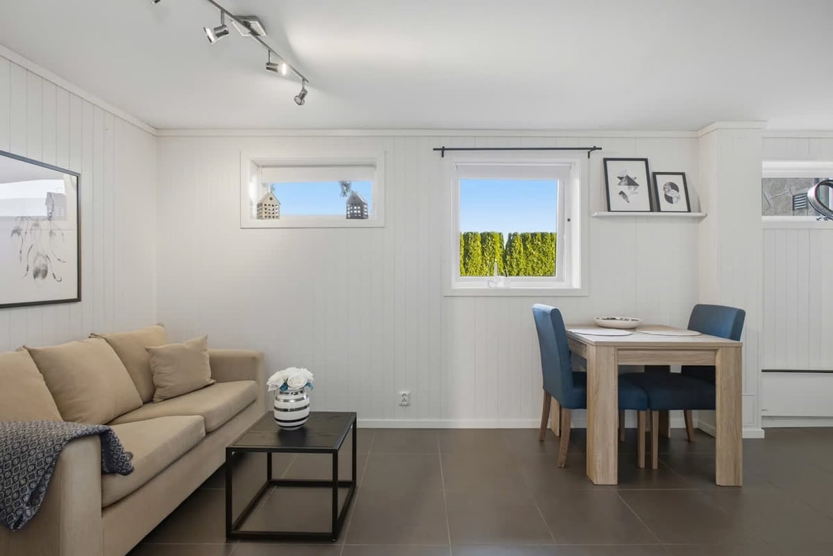 Egyszerű és békés szállás, központi helyen, rövid sétára az üzletektől, valamint a hegyi lifttel a vasútállomástól, az úszómedencétől és a központtól. Saját bejárat és kilátás a kertre és a fjordokra. A lakásban van egy teakonyha, egy kis nappali sarok kanapéval, 80 cm széles (lehetséges alvóhely), 1 hálószoba egyszemélyes ággyal, 2 x 75 cm. Emellett a folyosó és a fürdőszoba, beleértve a zuhanyzószekrényt is Egyéb fontos dolgok: internet, tévé Chromecasttal, mikrohullámú sütő, vízforraló, kávéfőző, kávéfőző és hűtőszekrény. Parkolóhely a kocsifelhajtón.