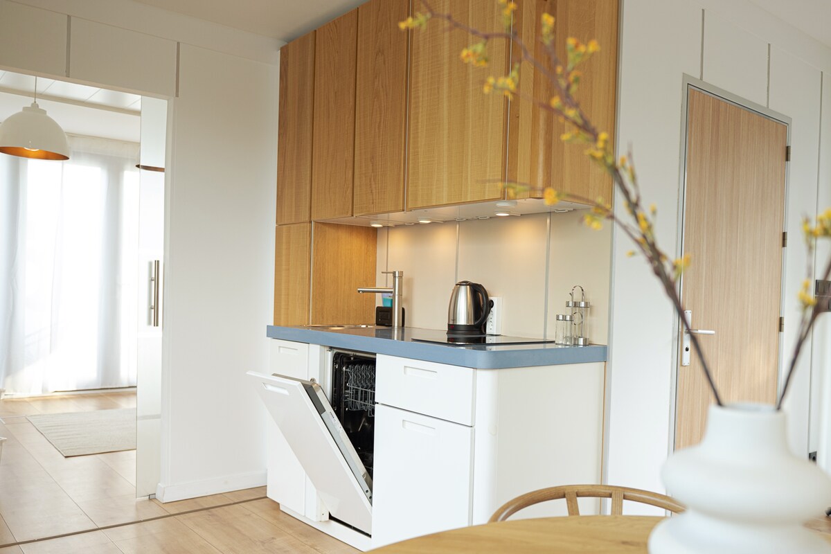 Hausboot Kielwasser: Stilvolles Hausboot im Hafen von Laboe, ca. 50 m², ideal für 2 Personen. Moderner Wohn-/Essbereich mit Panoramafenstern, Sonnenterrasse am Bug, großes Panoramadeck mit Lounge-Möbeln. Schlafzimmer mit Doppelbett, modernes Bad mit Dusche und WC. Infrarotheizung, verdunkelbare Plissees, WLAN. Highlight: Eigene Sauna an Bord. PKW-Stellplatz inklusive. Zentrale Lage – Strand, Restaurants, Einkaufsmöglichkeiten und Fördefähre fußläufig. Perfekt für Paare, die eine besondere Auszei