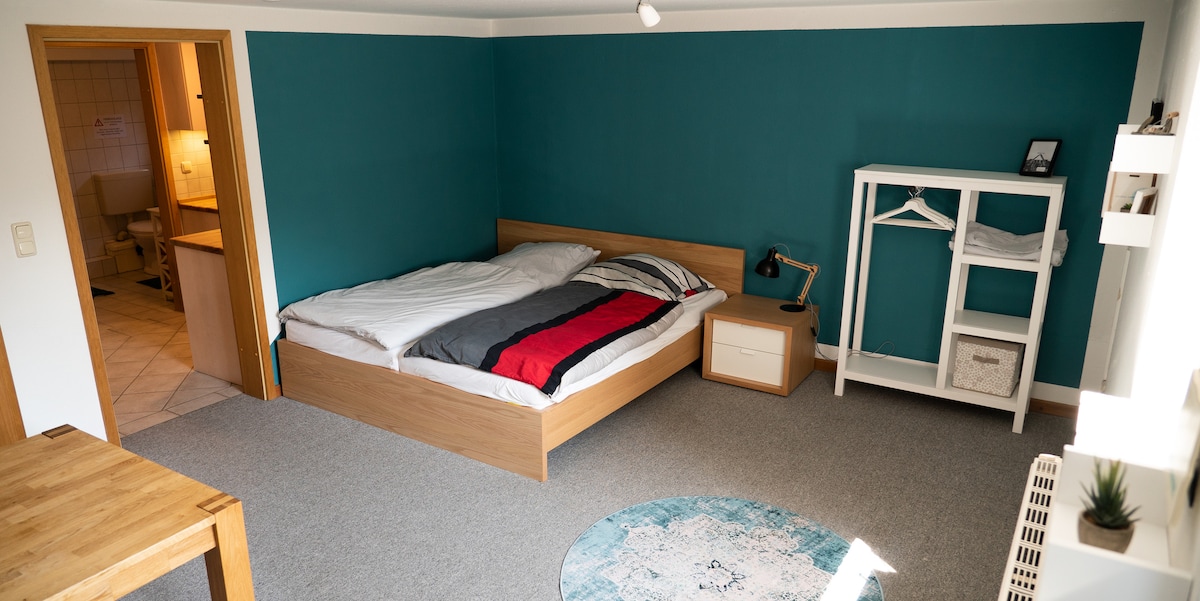 Gyönyörű, tágas 4 szoba egy nagyon békés helyen. 1 hálószoba franciaággyal (200 x 200 cm), 1 szoba nagy ággyal (140 x 200 cm) és vendégágy (90 x 190 cm) 1 WoZi kanapéval, étkezőasztallal, TV-vel, 1 elülső szobával és zuhanyzóval. Kérésre további összecsukható matrac is rendelkezésre áll. Mikrohullámú sütő, hűtőszekrény, melegvizes tűzhely, edények stb., de nincs saját tűzhely - ha szükséges, a konyha (egy emelettel magasabb) rövid megállapodás után használható. Rewe pékséggel sétatávolságra.