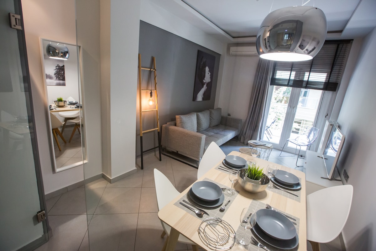 Belvárosi luxusapartman Thesszaloniki központjában. - Iktinou gyalogosnegyedében található. - Könnyű séta a város szívében található összes helyszínre - Modern dizájn, többnyire Bo Concept bútorok és bőséges természetes világítás - Kiváló minőségű matrac és párnák a franciaágyakon - Stílusos új fürdőszoba +konyha - 3 TV (2 intelligens 1 normál) - Független gázfűtés - Három inverteres légkondicionáló/C egység minden szobához + nappalihoz - Profi takarítás. - Tökéletes párok/ családok és barátok számára (2 járóka/grillszék)