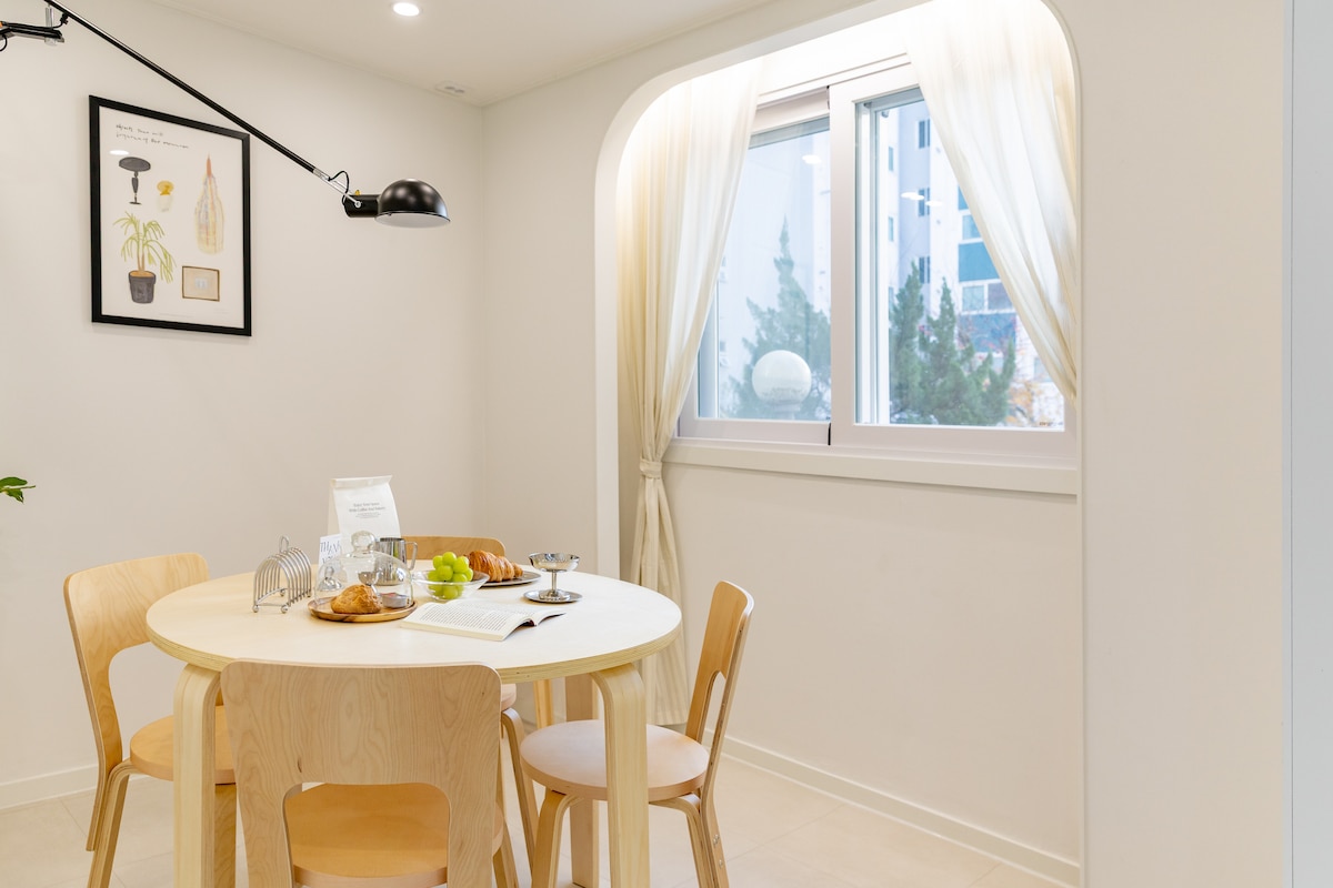 Experience the serene & cozy vibe of Under Cloud—a spacious 50m² home with two charming bedrooms, brick-finished living room, beautiful kitchen & bathroom, extra storage room, and a cozy balcony +hammock. In a quiet yet convenient area, offering easy access to Seoul’s best spots and the airport. Please click “Show more”. ☛ On foot Hongdae: 15min | Hapjeong Stn.(Line 2/6): 8min | 2 Malls: 5min ☛ By bus/subway Incheon Airport: 50min | Old Palaces: 30–40min | Myeong-dong: 30min | Gangnam: 40min