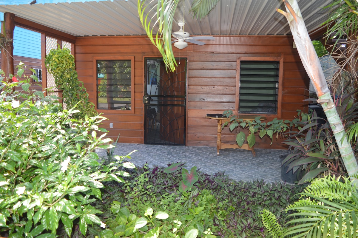 JASMINE, privát kerti szoba a Casa Placenciában, kompakt, magas mennyezettel, ablakokkal a friss levegőért, mennyezeti ventilátorral és légkondicionálóval; kis hűtőszekrény, mikrohullámú sütő, kávéfőző, kenyérpirító, turmixgép, edények; tv Firestickkel, 24/7 wifi, világítás és műalkotások, csempézett étkező/íróasztal és szék laptopos munkához, PRIVÁT ZUHANYZÓS FÜRDŐSZOBÁVAL. Jó kávét, teát és strandtörülközőket biztosítunk. Biztonságos és csendes környék, itt élek. 3 perc sétára a gyönyörű strandtól és a Placencia Beach Clubtól, a jól felszerelt élelmiszerboltoktól, kávézóktól és az Atlanti-óceán partjától.