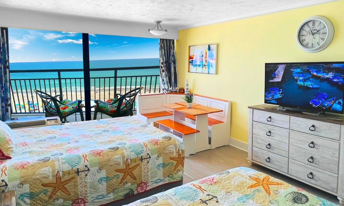 Beautiful ocean front condo unit at the Caravelle resort! This beautiful Condo features a direct ocean front view and outdoor balcony to enjoy the sites. The unit has two full size beds, a Murphy bed, and a queen pull out sofa sleeper perfect for that family getaway. The resort features amazing amenities, with a large heated pool, whirlpool, lazy river, kiddie pool and Wild Water Pool. The children can enjoy the Wild Water Pool featuring dump buckets and splashing fun! *Weather Permitting*
