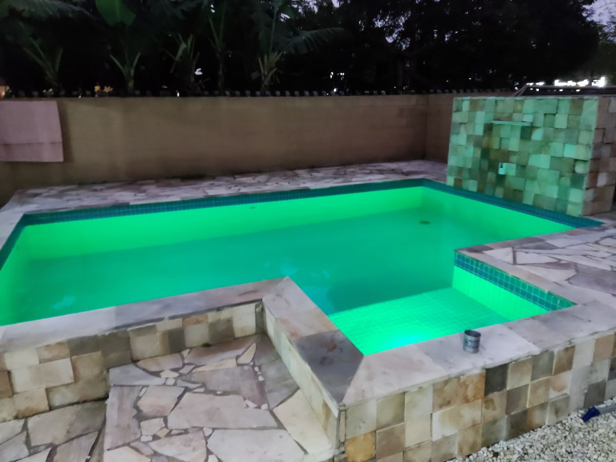 Perfeita para quem busca comodidade, a casa fica a apenas 1 quadra da Av. Central, com fácil acesso a tudo. São 4 quartos climatizados com vista para a piscina e acessos individuais pela área de lazer, garantindo mais privacidade aos hóspedes. A área externa é um destaque à parte, com uma ampla piscina com prainha e Spa aquecido ♨️, ideal para relaxar em qualquer época do ano. A cozinha gourmet é completa, com churrasqueira, ilha e todos os utensílios.