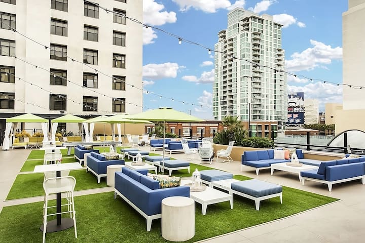 Lépj be San Diego belvárosának legjavába, miközben kihasználod az első osztályú szolgáltatást és a számos olyan funkciót, amelyet mind az üzleti, mind a nyaralók szem előtt tartásával terveztek. Pihentető létesítményünk számos praktikus kényelmi szolgáltatásáról ismert, amelyek közé tartozik a tetőtéri medence, a tűzrakóhely, a privát kabinok, a kerékpárkölcsönzés, a fitneszközpont és az üzleti központ. A háziállatokat felár nélkül fogadjuk az ingatlanunkban, így egyszerűen láthatod San Diego híres Gaslamp Quarter negyedét a négylábú társaiddal. Ingatlanunk egy kényelmes gyöngyszem a város szívében!