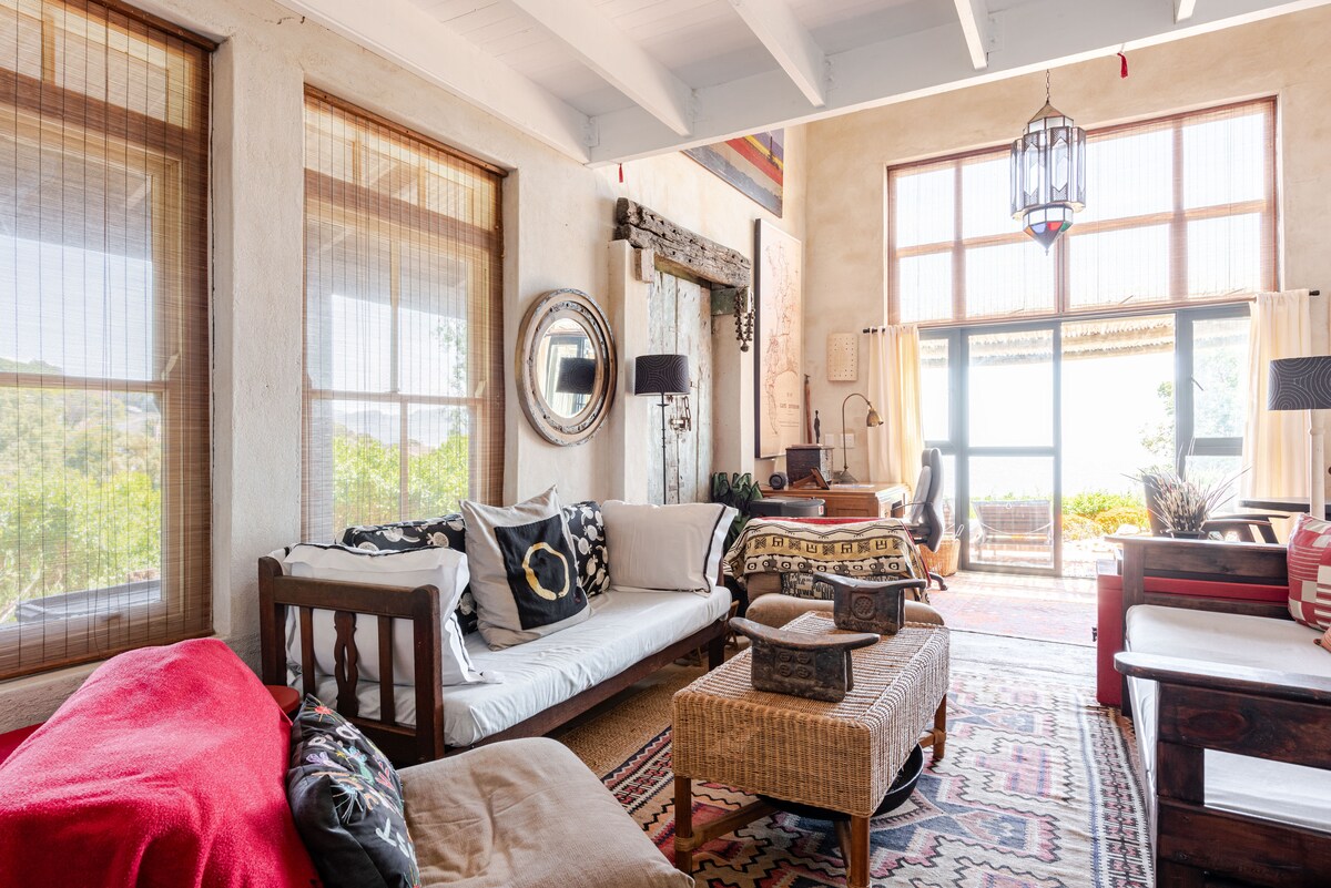 This charming retreat nestled in a historic property on the edge of Kommetjie has an extensive interior with room for family and friends. The main bedroom features both a queen-size and single bed, with another queen-size bed in the lounge area. A fully equipped kitchen and dining area, 2 private patios offering serene spaces. Our high-speed.WiFi supports a productive home office. Guests can enjoy ocean and mountain views from the extensive shared indigenous garden with pool, BBQ and lounge area